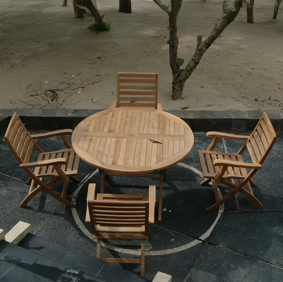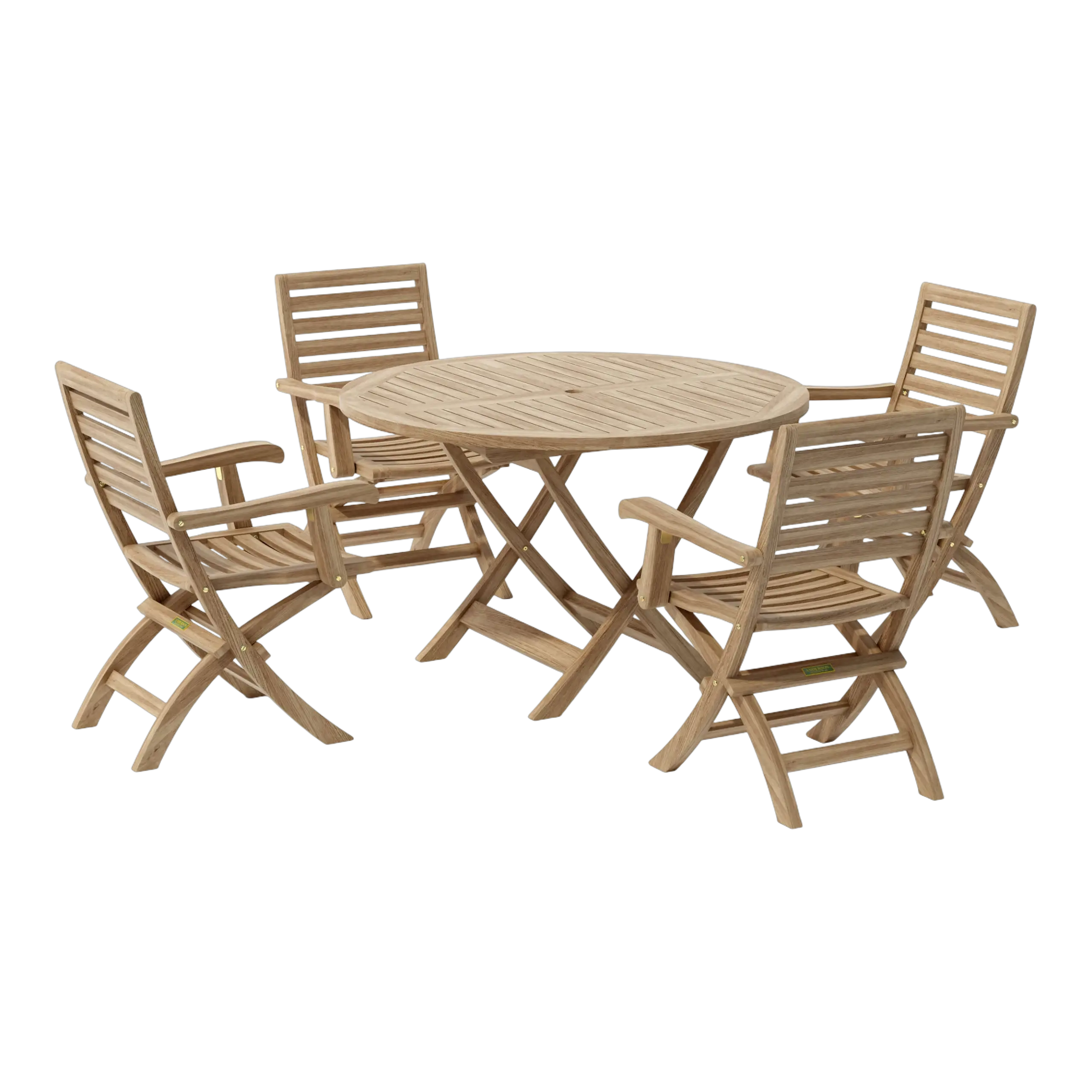 A versatile dining set for the outdoors, the Bahama 47″ Round Folding Table with four Andrew Folding Armchairs is a convenient and easily accessible dining set for storage and movement when not in use. Simply fold and unfold the set in seconds; the perfect furniture set for boating, restaurant, and café where space is limited or where chairs are only required occasionally. Made of premium grade unfinished teak, this set is sanded smooth for a natural smooth touch.