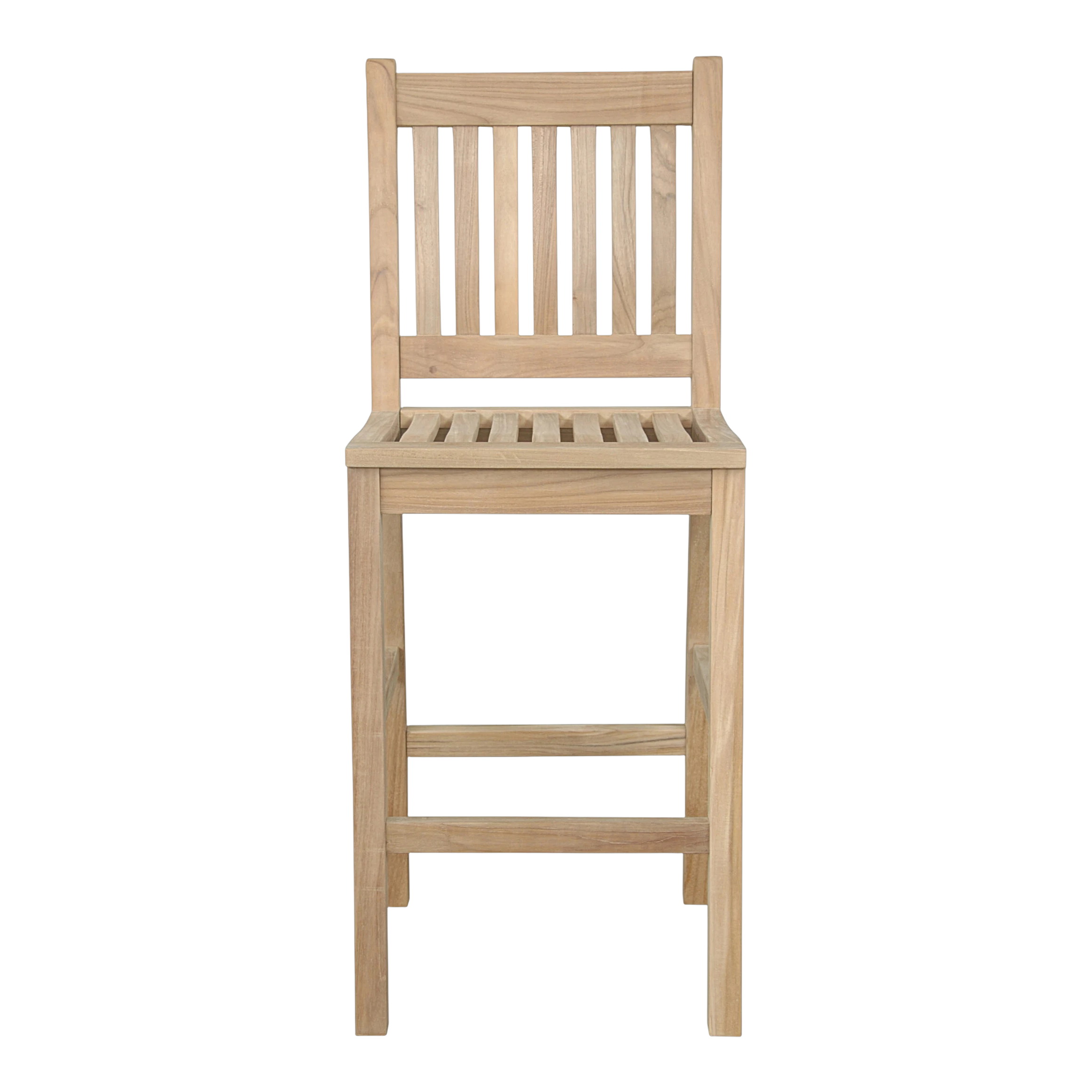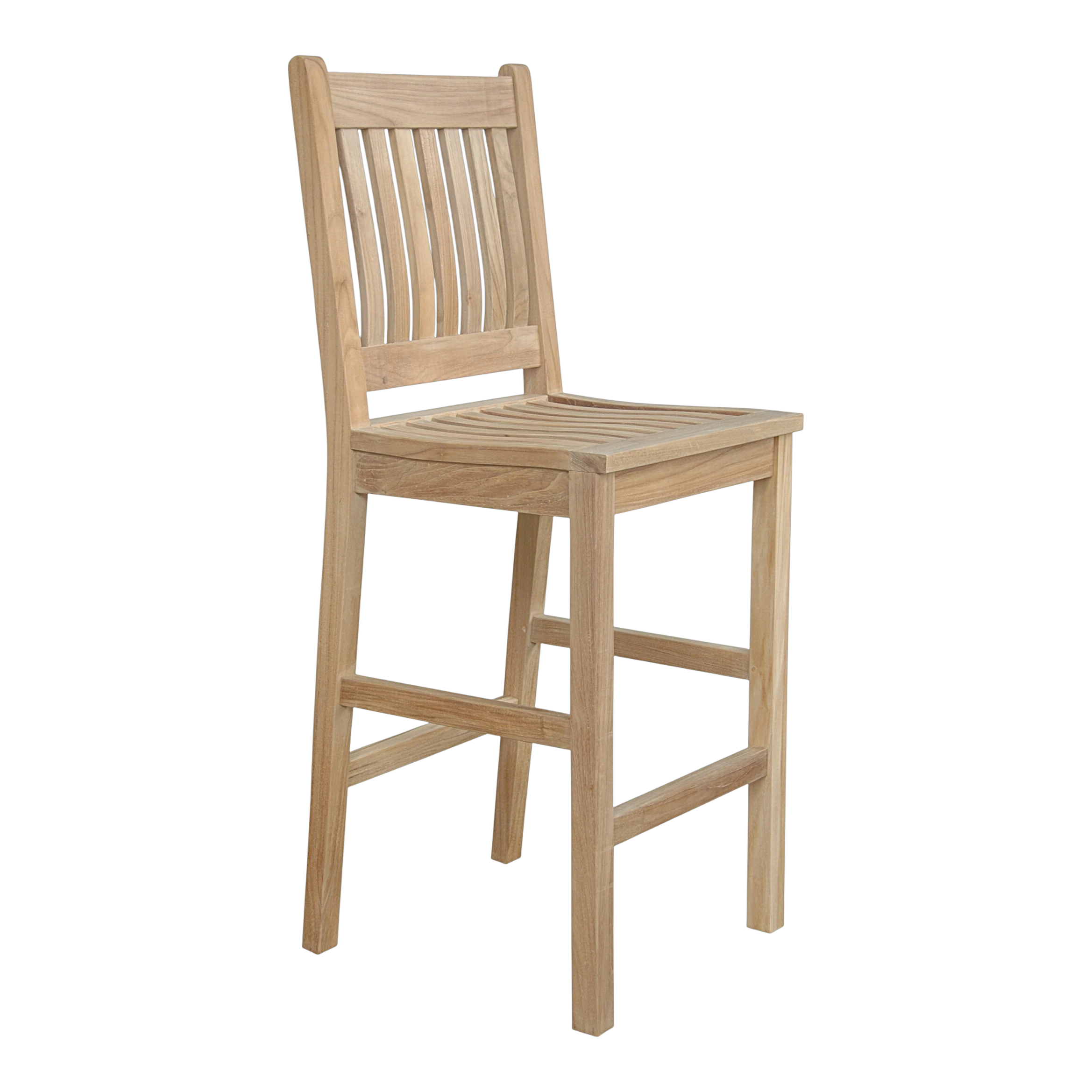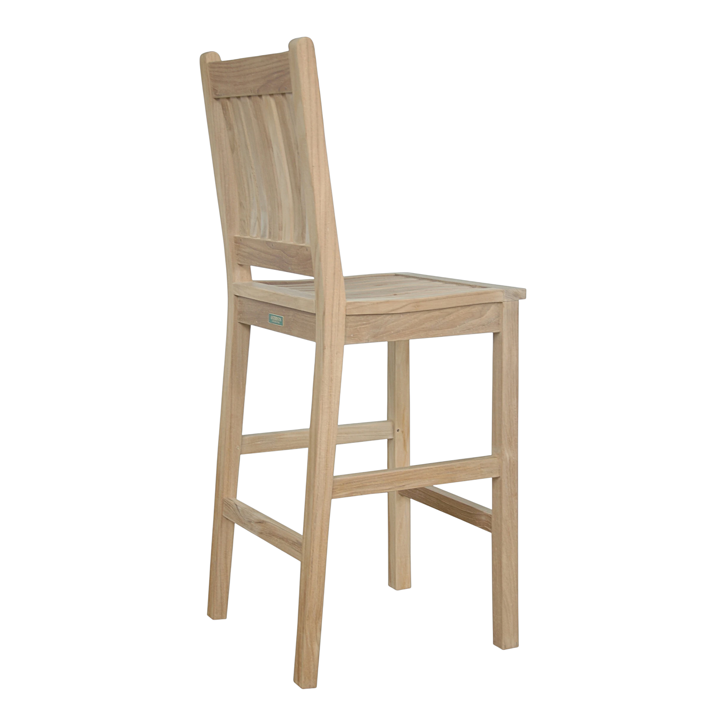 This Avalon Bar Chair is the perfect high bar teak patio chair for the yard and patio. Designed with sculpted curved seats for added comfort, it also features a sturdy footrest for leg support and stability. Built of premium solid teak wood, it is kiln-dried and sanded smooth without finish in its natural form and color. Add Sunbrella All-Weather fabrics and cushions, a water repellent material that prevents mildew, mold, and discoloration for additional added comfort. Blends perfectly with any outdoor bar table or from one of Anderson Teak’s numerous bar table collection.