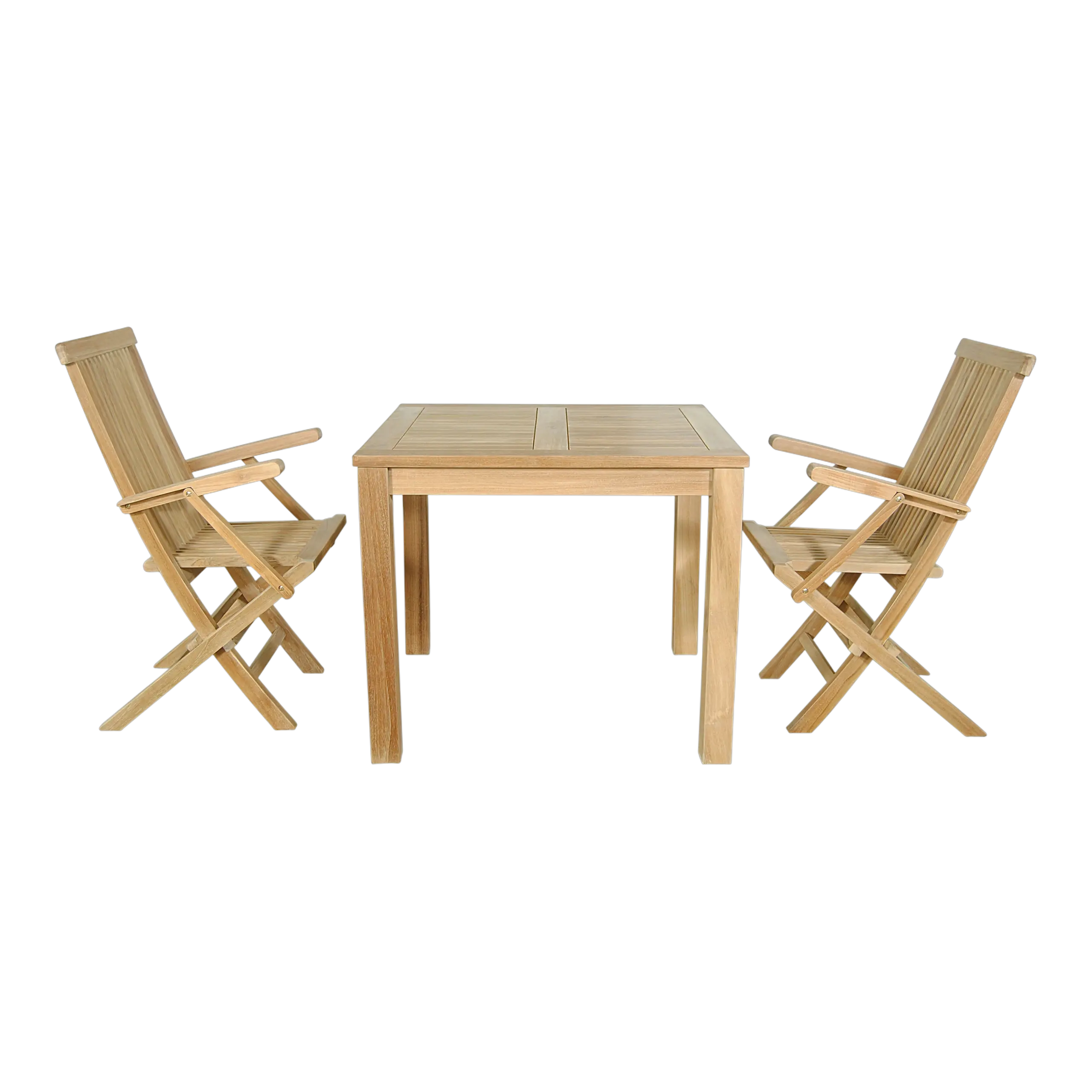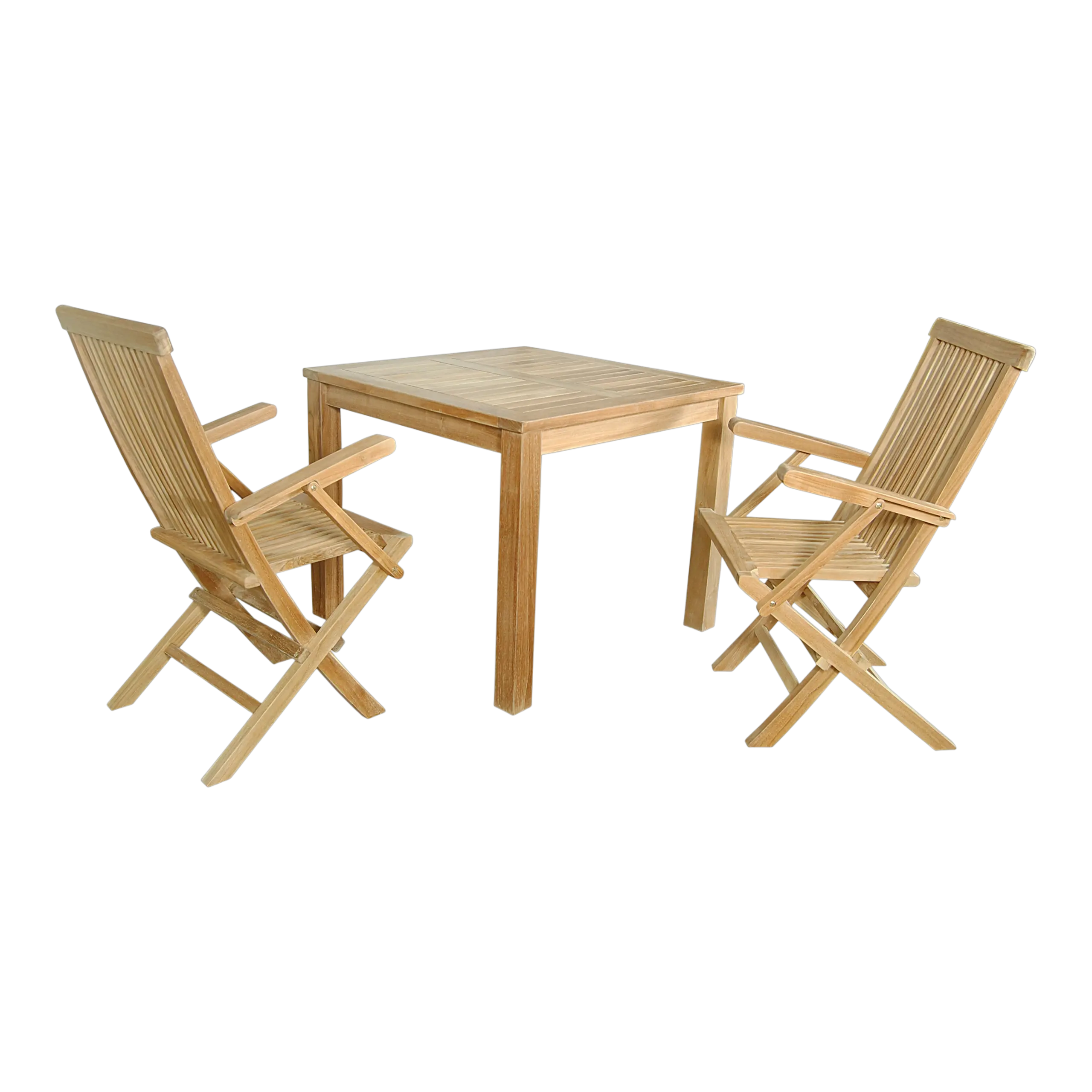 1 TB-035SQ Bahama 35″ Square Dining Table2 CHF-102 Classic Folding ArmchairTeak WoodCushion is not includedMade with kiln-dried, grade A teak wood.Cushions (optional) are made of Sunbrella fabric, a water repellent material, preventing mildew and fadingInner cushion is made of foam with a Dacron wrap. Total thickness is 2″QuickShip Cushions available in Natural, Burgandy, JockeyRed, Teak, Navy, Linnen Antique Beige, Linen Champagne, & Forest Green