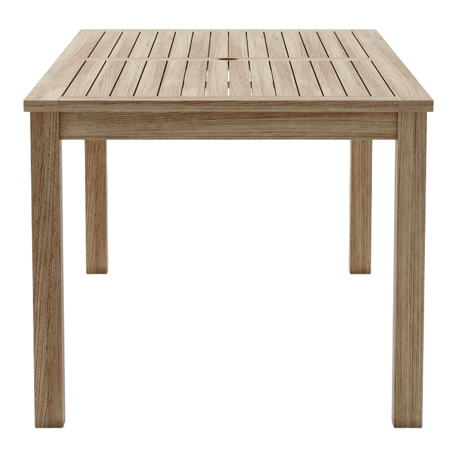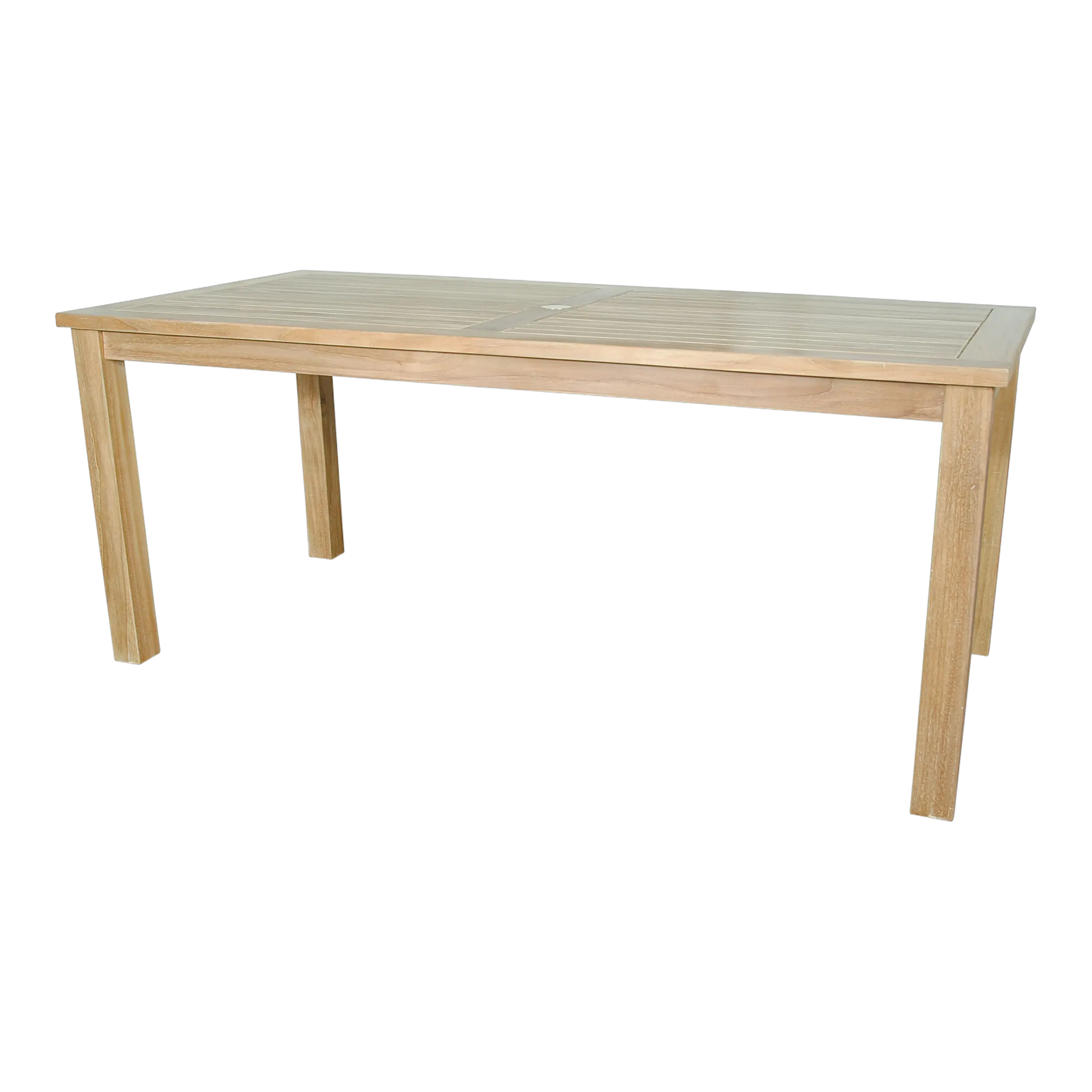 This Bahama 70” Rectangular Dining Table is a wide and bulky outdoor teak table built for a lifetime of use with any teak chair or bench. With seating up to 6 people, enjoy an outdoor dining experience with this table, made of Genuine Solid A-Grade Teak Wood, sanded smooth to the touch in a natural finish. Features an umbrella hole in the center with brass plug included.