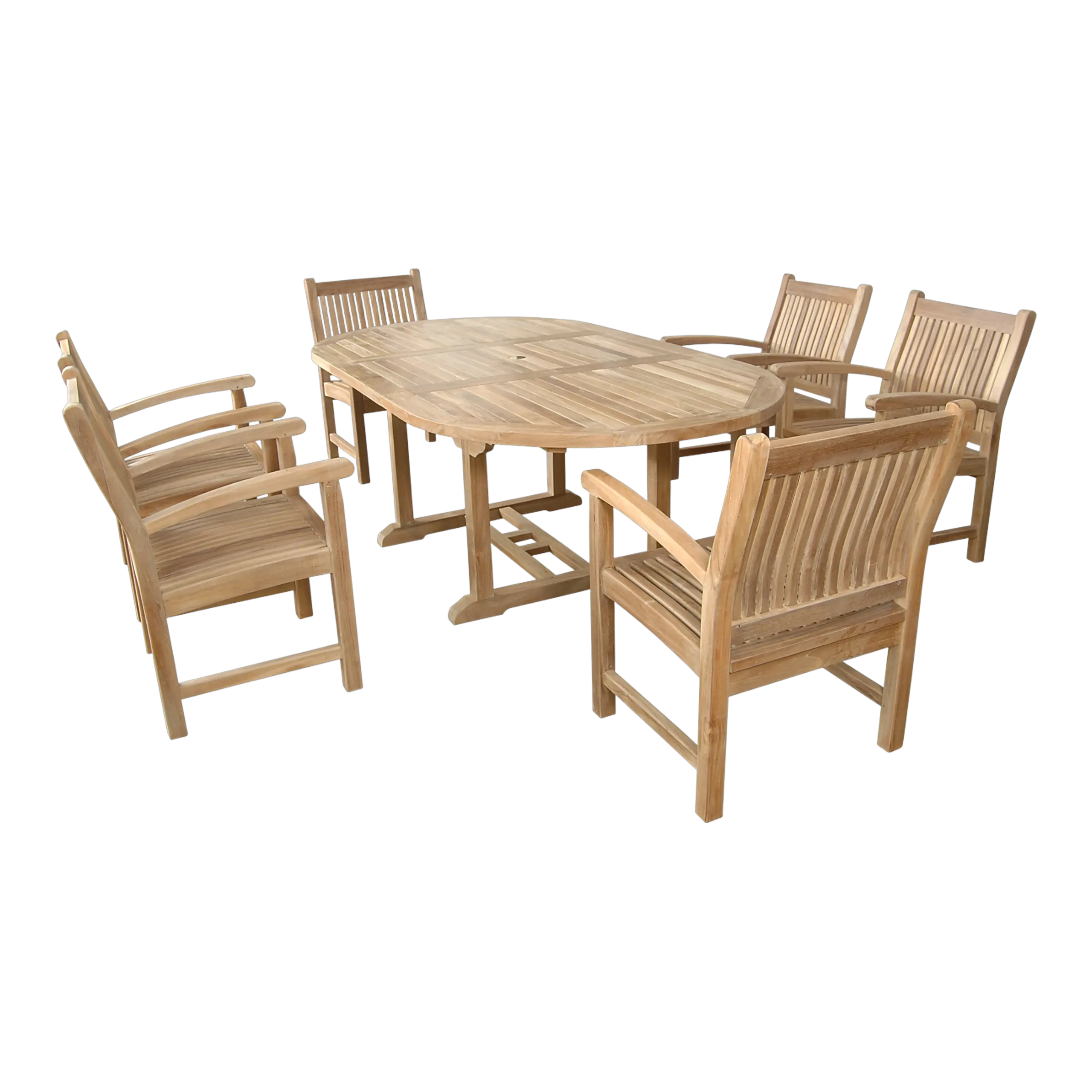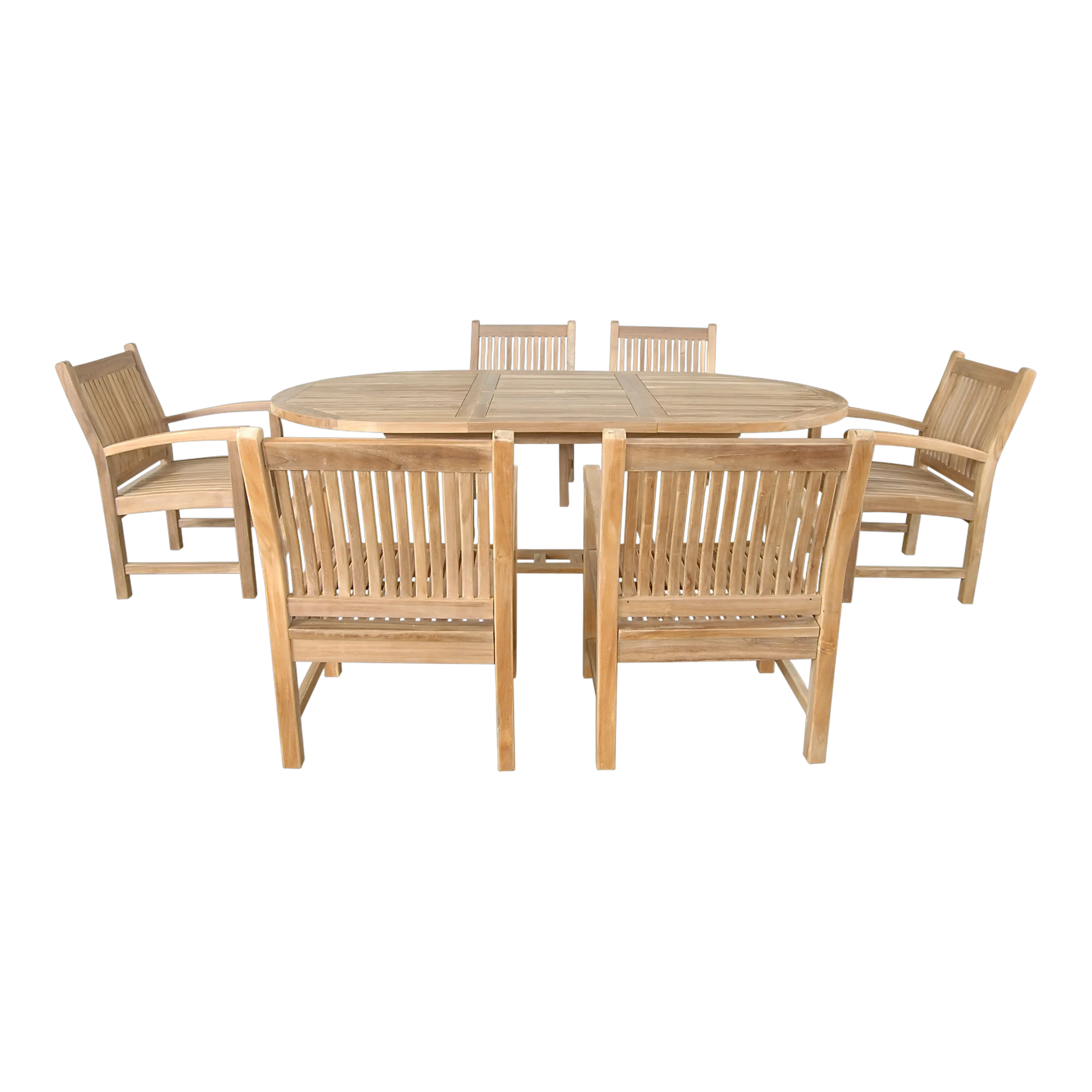 1 TBX-087VT 87″ Oval Extension Table6 CHD-112 Sahara Dining ArmchairTeak WoodCushion is not includedBuilt with extra thick Grade A quality teak to last for generations. It comes in knocked down, with easy assembly. After all, it is perfect for your party family and friends gathering.Made with kiln-dried, grade A teak wood.Cushions (optional) are made of Sunbrella fabric, a water repellent material, preventing mildew and fadingInner cushion is made of foam with a Dacron wrap. Total thickness is 2″QuickShip Cushions available in Natural, Burgandy, JockeyRed, Teak, Navy, Linnen Antique Beige, Linen Champagne, & Forest Green