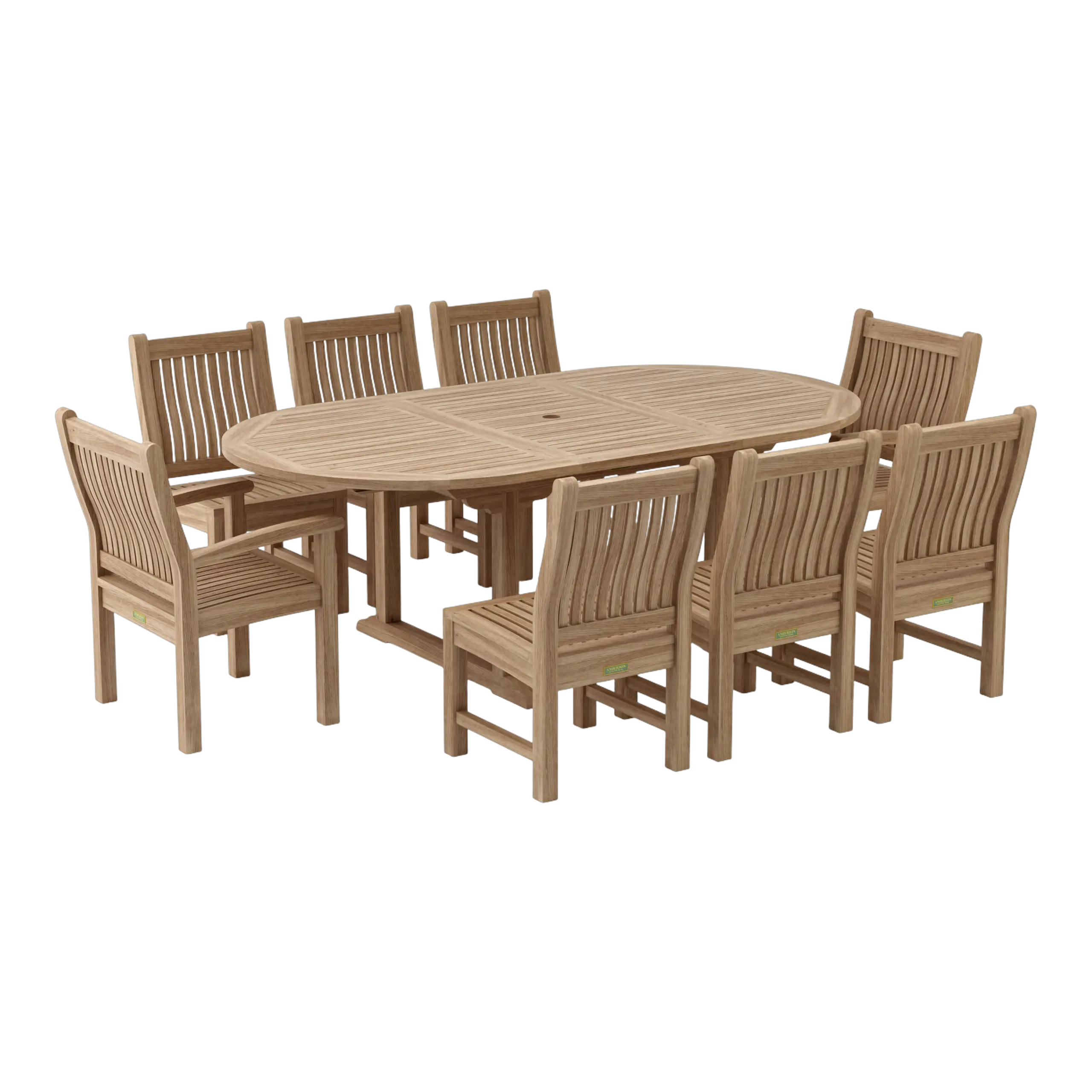 1 TBX-087VT 87″ Oval Extension Table6 CHD-111 Sahara Dining Chair2 CHD-112 Sahara Dining ArmchairCushion is not includedBuilt with extra thick Grade A quality teak to last for generations. It comes in knocked down, with easy assembly. After all, it is perfect for your party family and friends gathering.Made with kiln-dried, grade A teak wood.Cushions (optional) are made of Sunbrella fabric, a water repellent material, preventing mildew and fadingInner cushion is made of foam with a Dacron wrap. Total thickness is 2″QuickShip Cushions available in Natural, Burgandy, JockeyRed, Teak, Navy, Linnen Antique Beige, Linen Champagne, & Forest Green