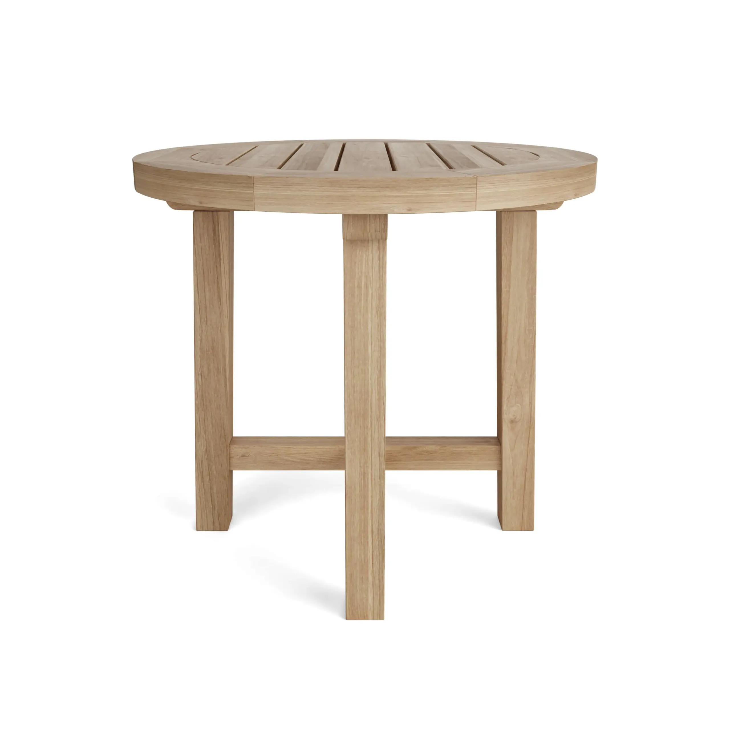 The perfect side table for the patio and yard, this round and sturdy teak table is the perfect complement to any chair, sofa, or bench. Always have a spot to place your favorite book, drink, or item next to you while you lounge in comfort. Finished in water based sealer for added protection against weathering of sun, wind, rain or hail. Features cross legged support for added stability.