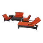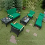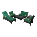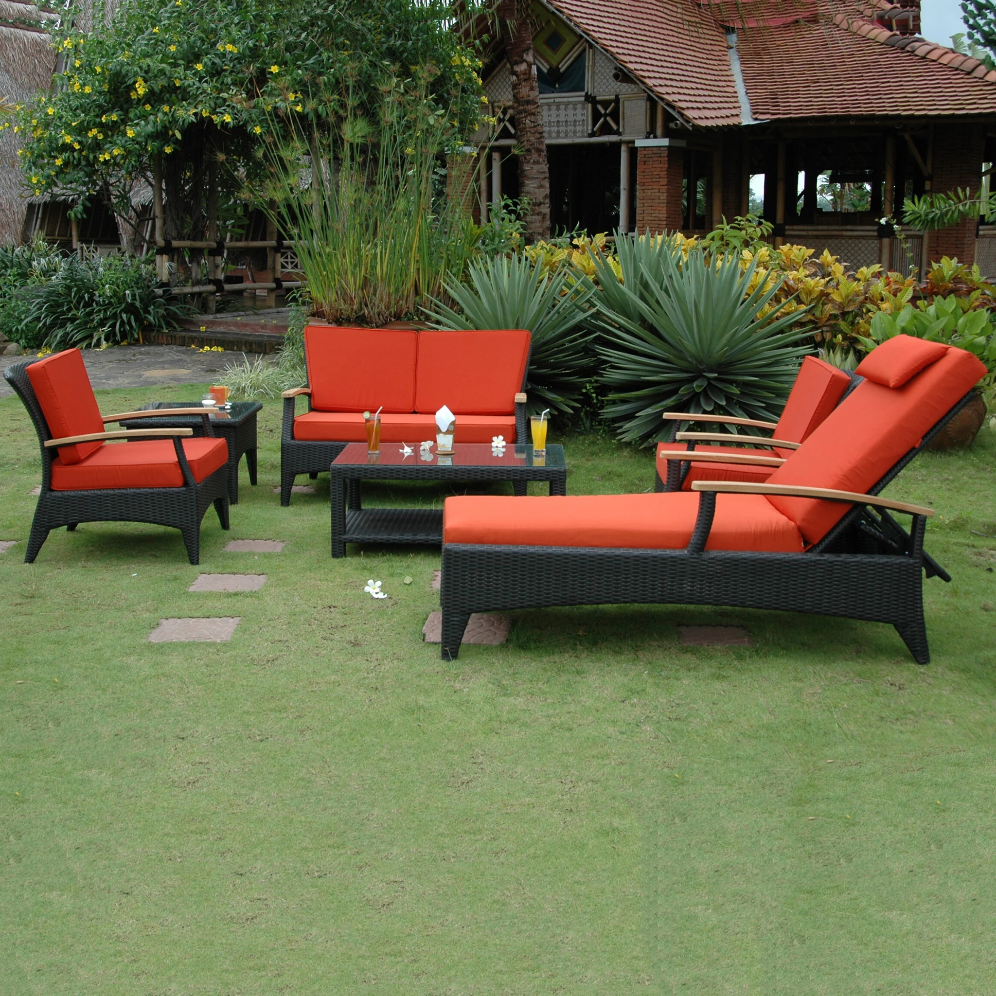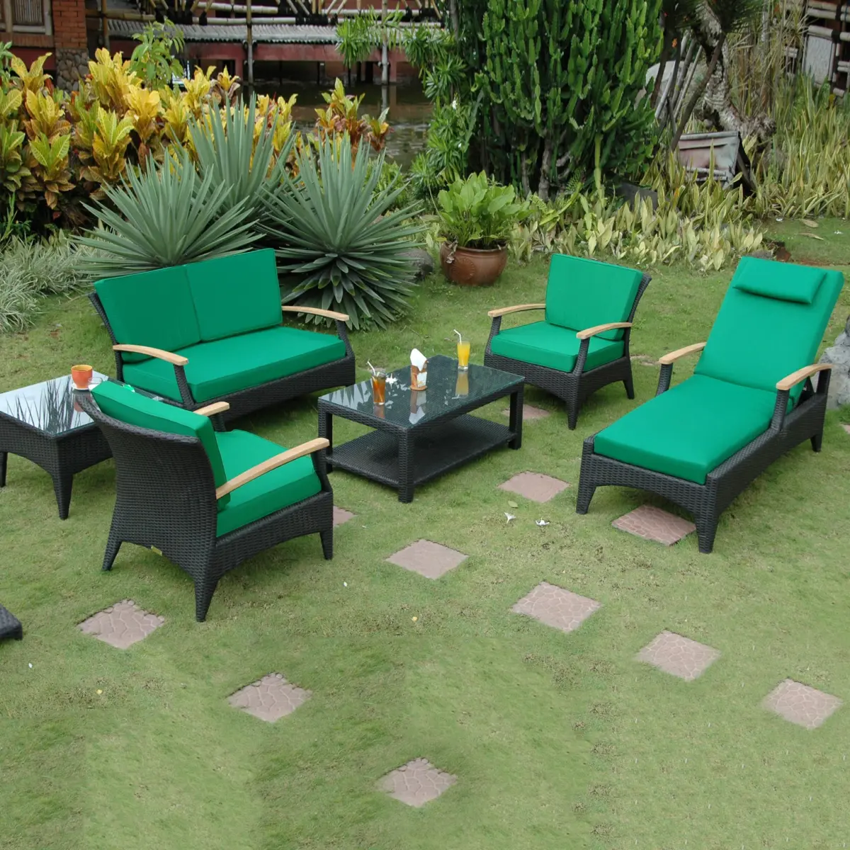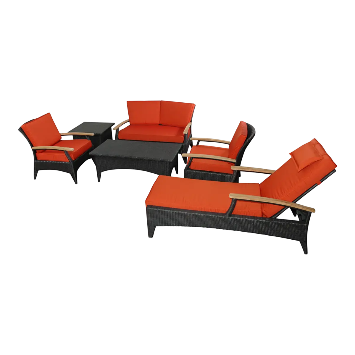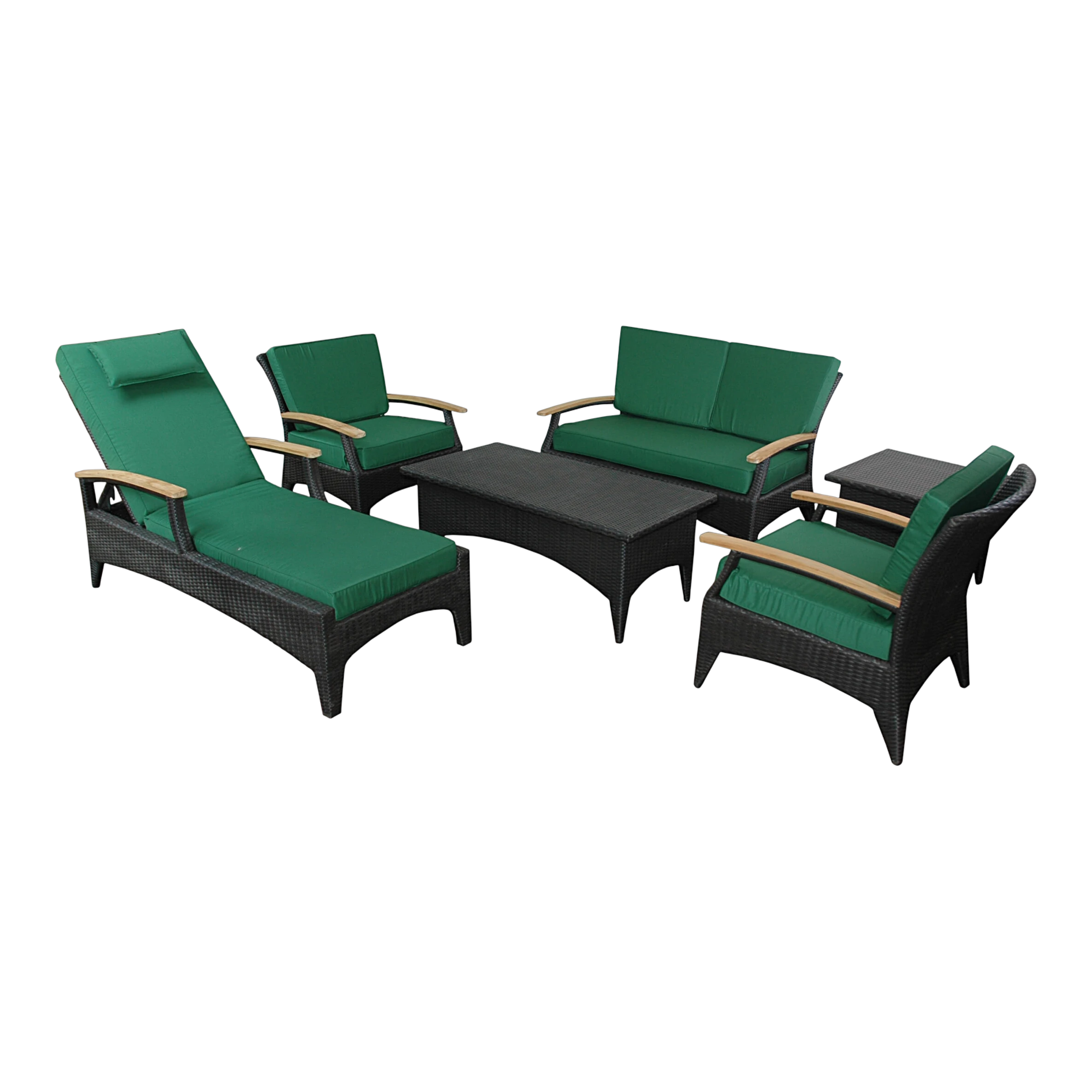 Come with dark green or terracotta cushion color choices1 TB-016CT Bellagio Rectangular Coffee Table2 DS-016A Bellagio Deep Seating ArmchairTB-016SQ Bellagio Square Side Table1 SL-016 Bellagio Sun Lounger w/ Teak Wood Arm1 DS-016LS Bellagio Deep Seating Loveseat1 DS-016LS Bellagio Deep Seating Loveseat1 SL-016 Bellagio Sun Lounger1 TB-016SQ Bellagio Square Side TableMade of a superior-quality Polyethylene-based fibercharacterized by high flexibility and tensile strength. Weaving for beauty and comfort.