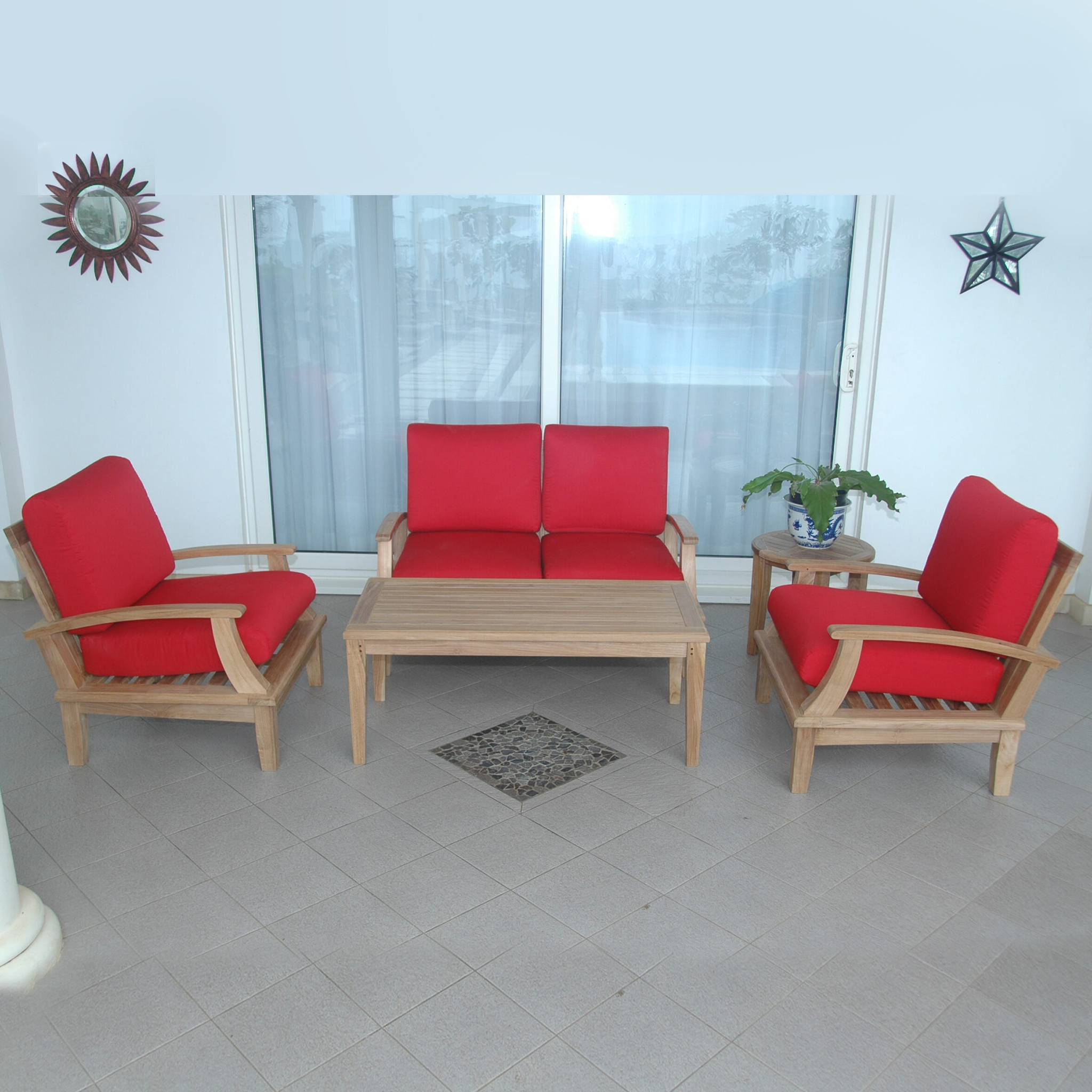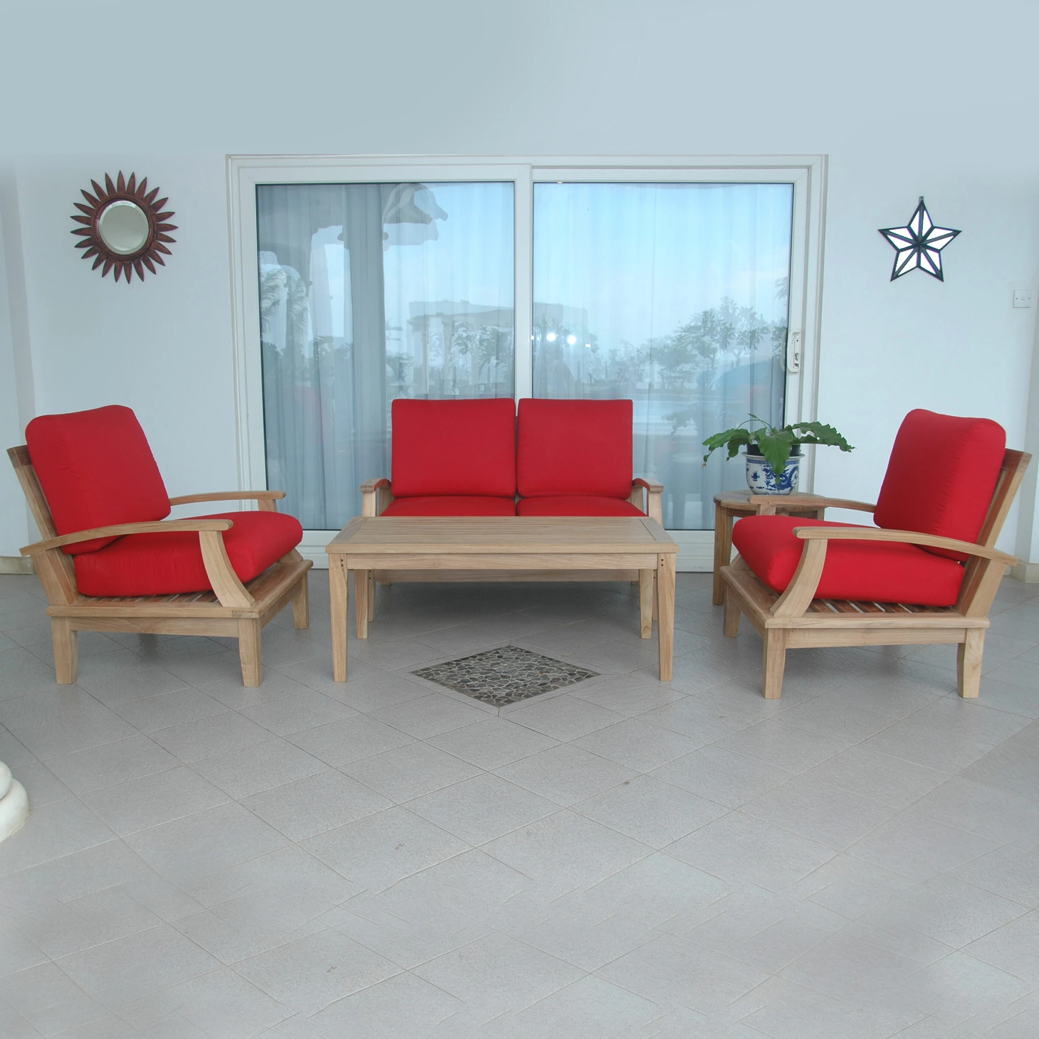 1 DS-102 Brianna Deep Seating Love Seat2 DS-101 Brianna Deep Seating Armchair1 TB-105 Brianna Rectangular Coffee Table1 TB-106 Brianna 20″ Round Side TableComfortable Sunbrella cushions that will last outdoors without mildew, and minimal discoloration.Made with kiln-dried, grade A teak wood.Cushions (optional) are made of Sunbrella fabric, a water repellent material, preventing mildew and fadingInner cushion is made of foam with a Dacron wrap. Total thickness is 2″QuickShip Cushions available in Natural, Burgandy, JockeyRed, Teak, Navy, Linnen Antique Beige, Linen Champagne, & Forest GreenCustom Order Cushions available in 36 colors from Sunbrella