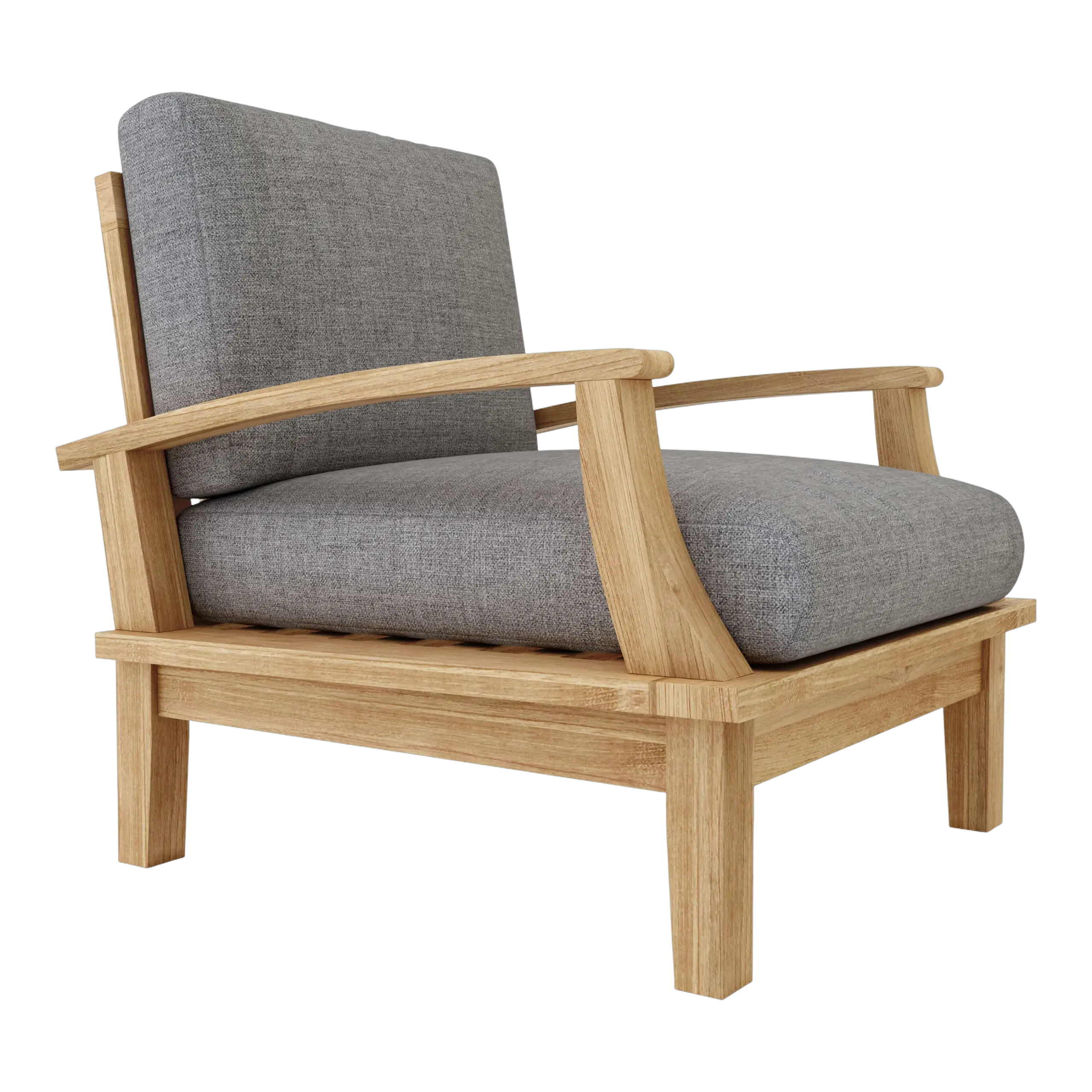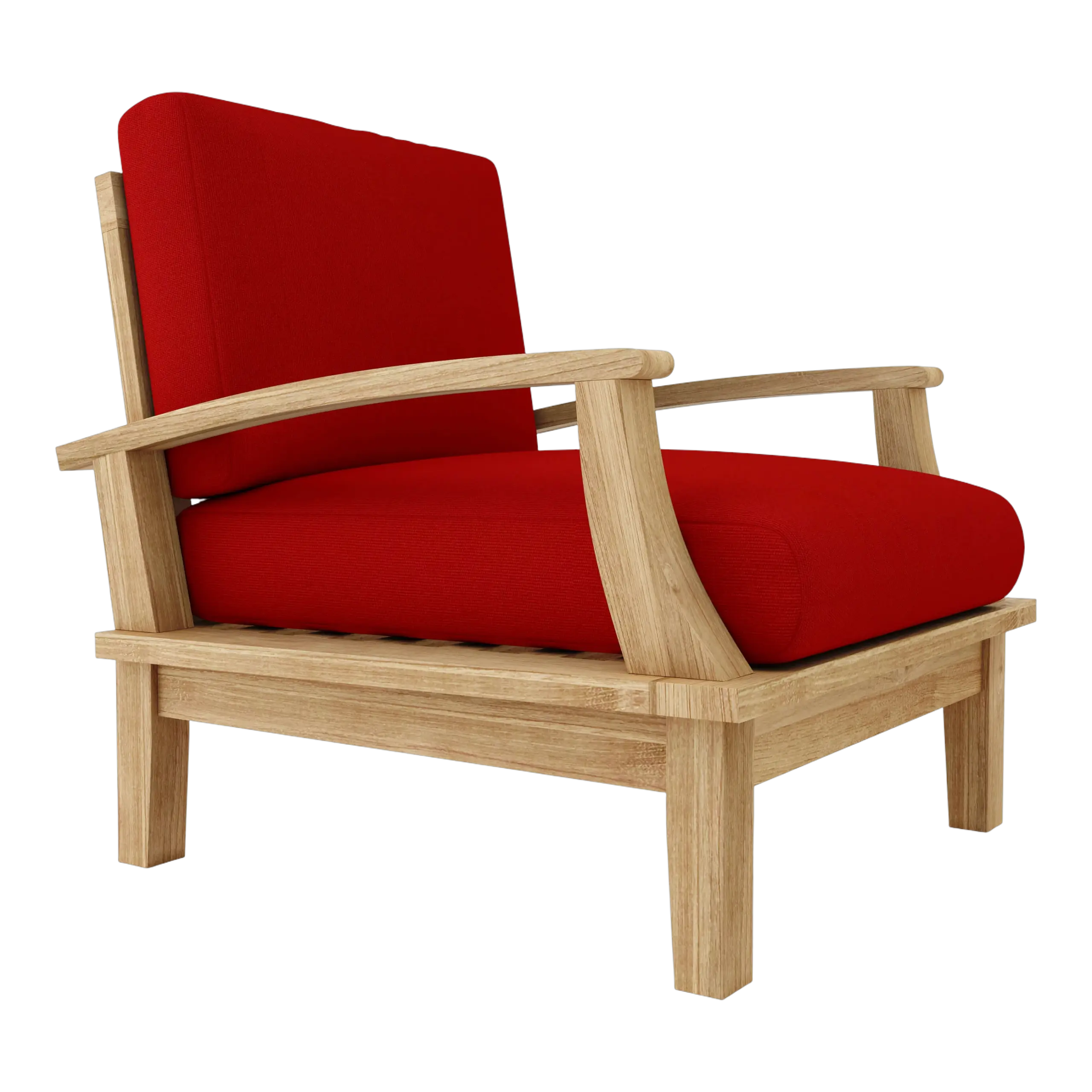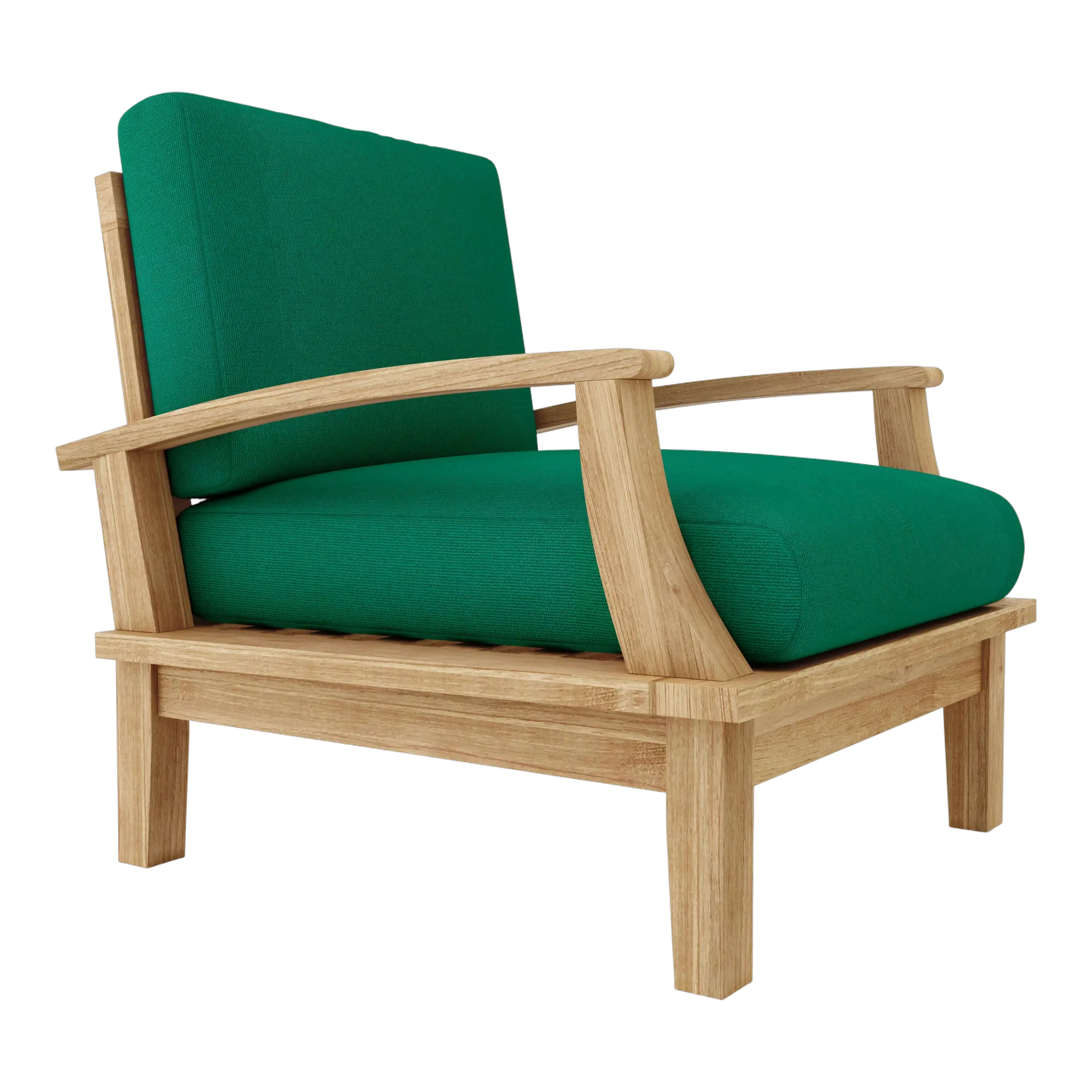 Brianna Deep Seating ArmchairTeak WoodEstimate weight capacity: 300 lbsAnderson Teakcomfortable cushions that will last outdoors without mildew, and minimal discoloration.QuickShip Cushions available in Natural, Burgandy, JockeyRed, Teak, Navy, Linnen Antique Beige, Linen Champagne, & Forest Green (1 week faster)Custom Order Cushions available in 36 colors from SunbrellaTeak outdoor furniture with premium quality products. Â