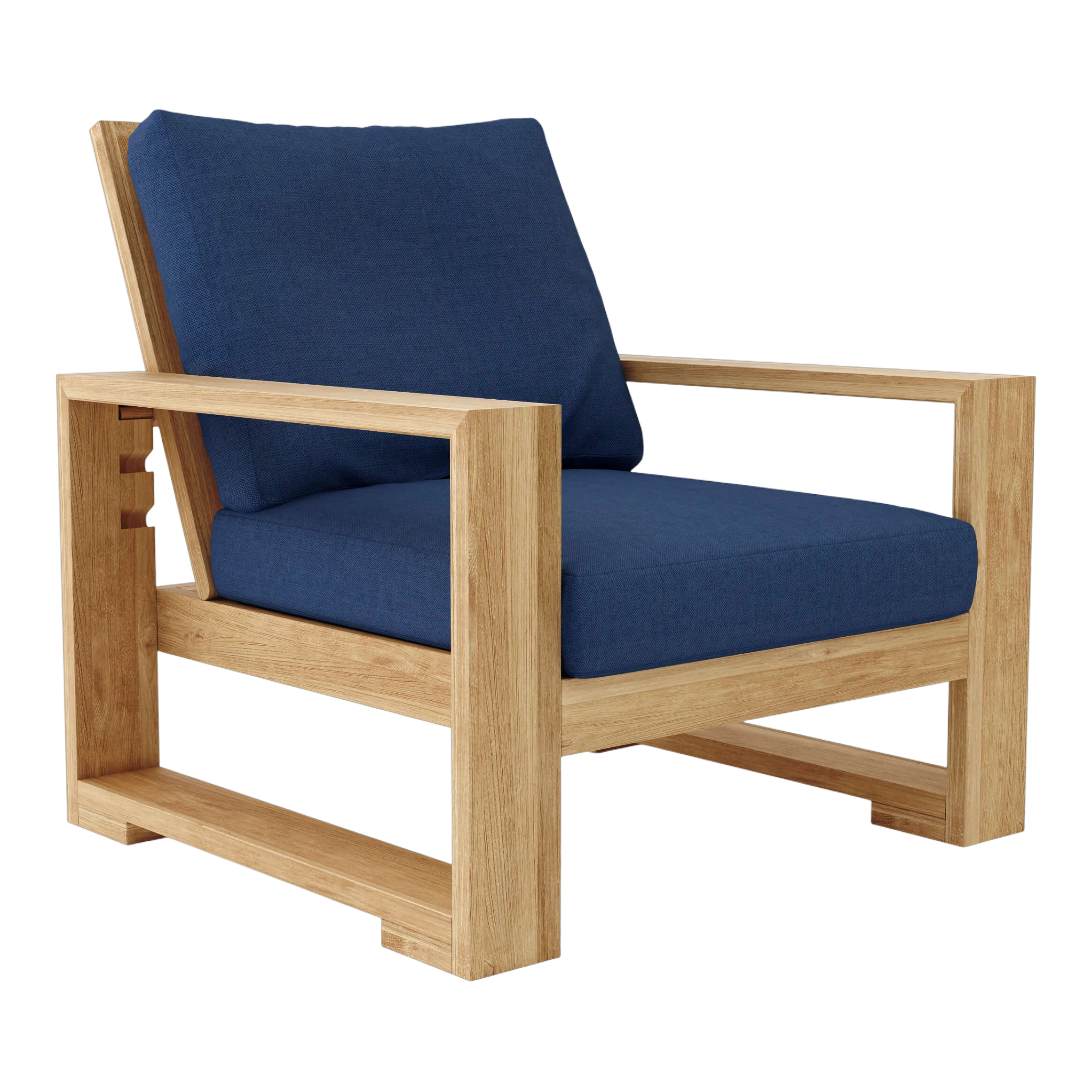 This Capistrano Deep Seating Armchair is the perfect addition for any home or patio décor. Crafted from Grade-A Teak unfinished and sanded smooth, its supported with Sunbrella All Weather cushions that will last outdoors without mildew or discoloration. A perfect match with any piece of the Capistrano Collections, it is elegant, modern and stylish. It comes knocked down, with easy assembly and back support adjustable up to four positions. Available as part of the Capistrano Deep Seating Collection which includes the Capistrano Loveseat, Sofa, Ottoman, Coffee Table and Side Table.