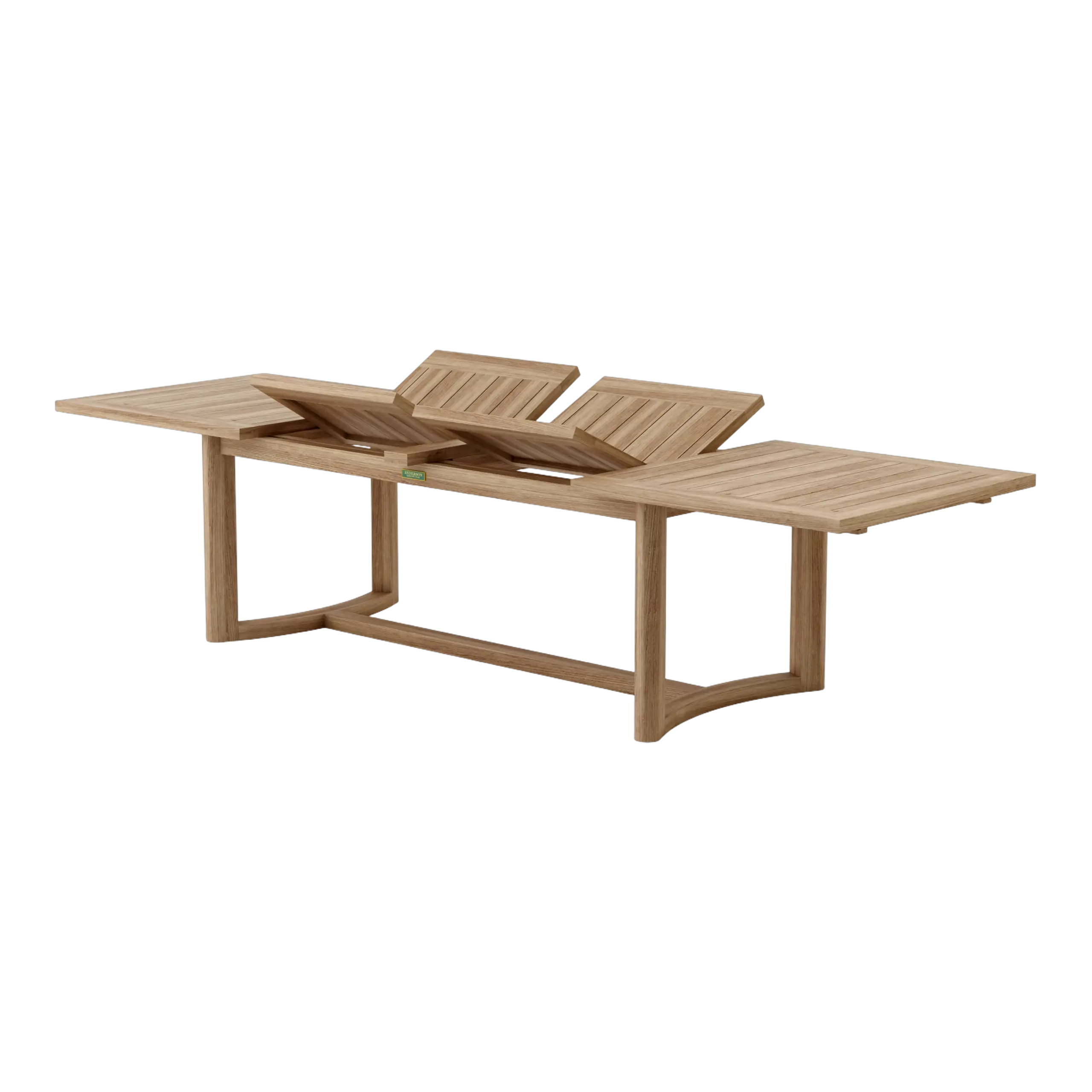 This solid teak Catania Extension Table is the perfect large dining table for your next outdoor dinner gathering. Made of unfinished premium teak wood, it’s the perfect table for continued outdoor use requiring little to no maintenance. The built-in butterfly pop-up leaf enables you to open or close your table in less than 15 seconds, and the table can be extended with 1 or 2 leaves depending on the size needed, seating up to 10 to 12 people comfortably. Simply slide open one or both of the extension leaf’s on either end to reveal two extra leaf’s in the middle. Includes umbrella hole with wooden plug when not in use.