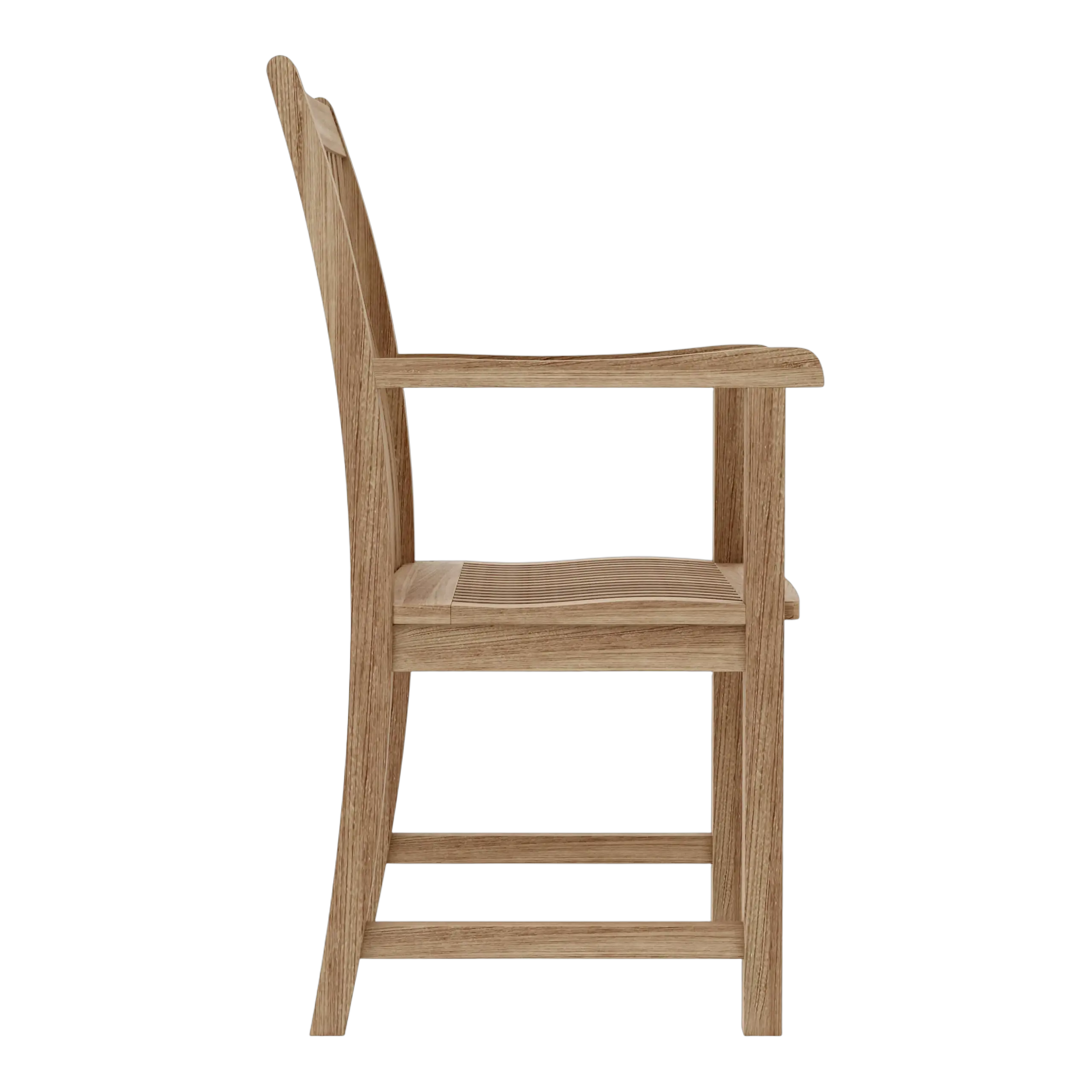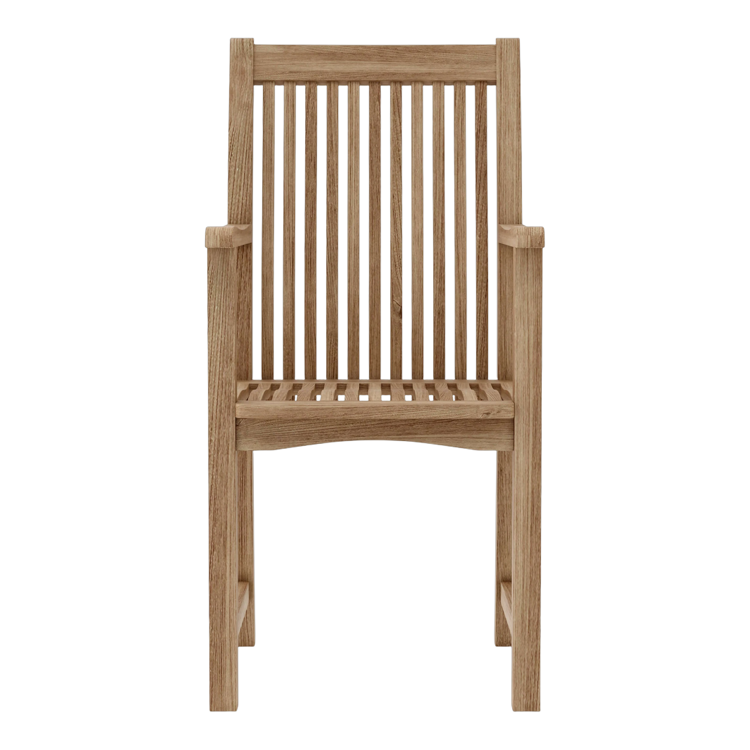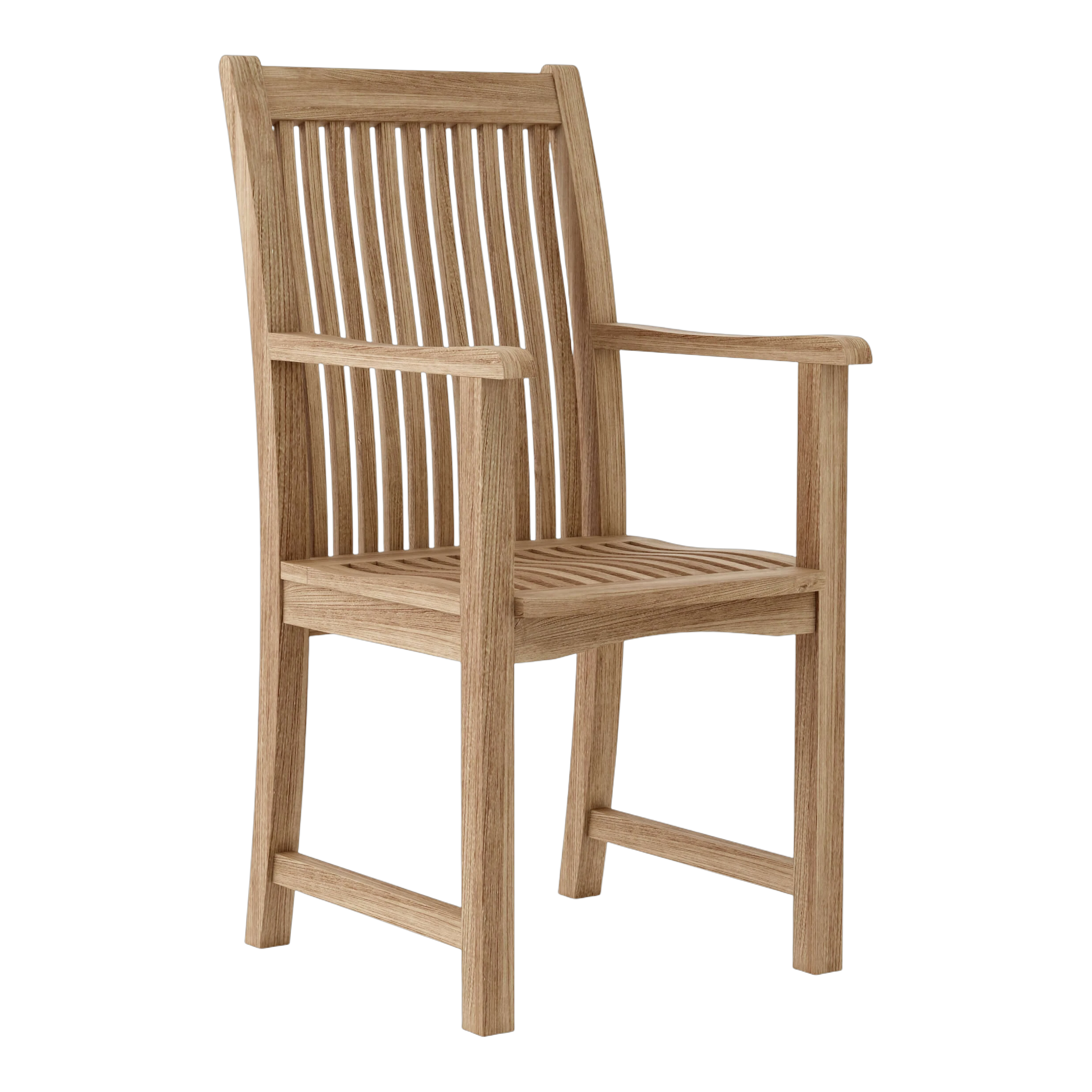 The Chicago Dining Armchair is a classic piece of furniture that will never go out of style, but quietly blends with any décor or setting. The seat is sculpted for added comfort but is also sturdy, as is the back support that’s made of individual teak slats. Made with kiln-dried, Grade-A Teak wood, it is the perfect material for weathering the outdoors. Place this chair in your backyard with a dining table for an outdoor dining experience. Overtime, the table will weather into a patina grey, or scrub down with soap and water to keep in pristine condition. This is a beautiful and functional piece of furniture for your patio or terrace.