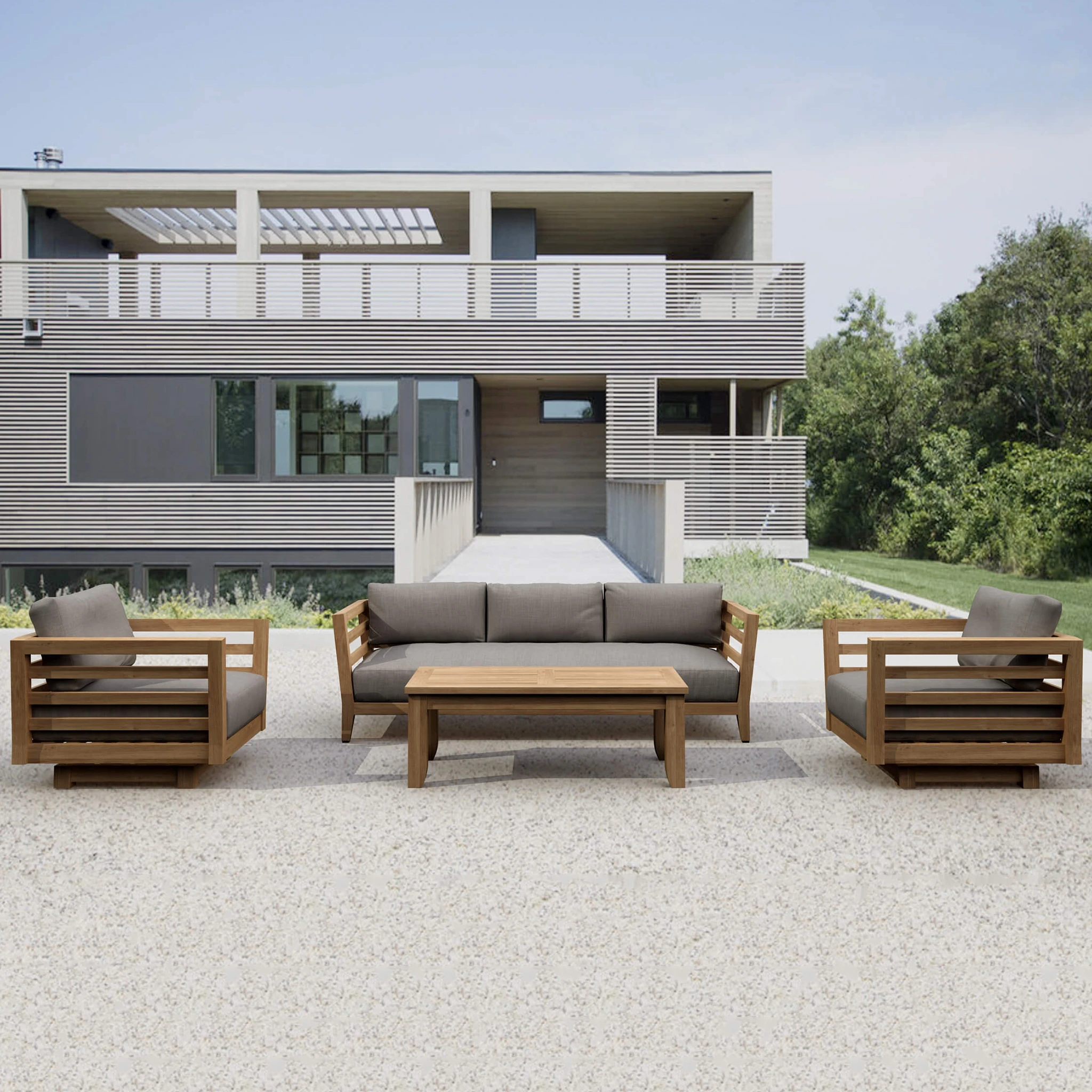 Unfinished well sanded kiln dried A-grad teak woodComes in flat carton box for efficient shipping and light/easy assembly requiredPerfect for outdoor or indoor use2 pieces of DS-838 Cordoba Deep Seating Swivel Armchair1 piece of DS-833 Cordoba Deep Seating Sofa1 piece of DS-506 Cordoba Rectangular Coffee TableComes with Sunbrella cushion