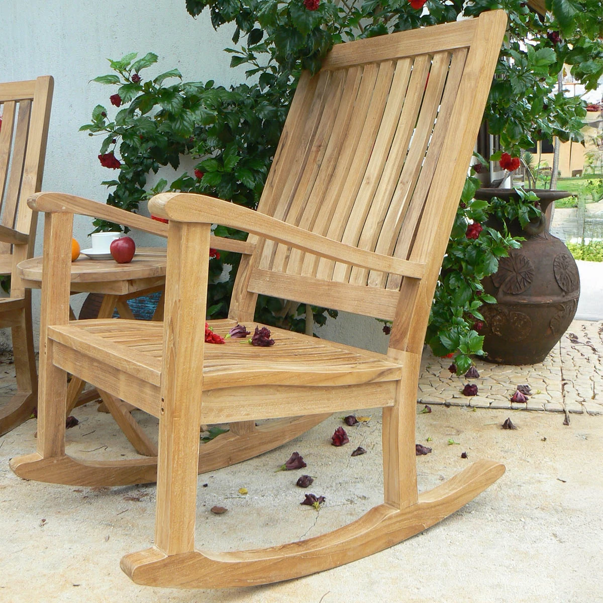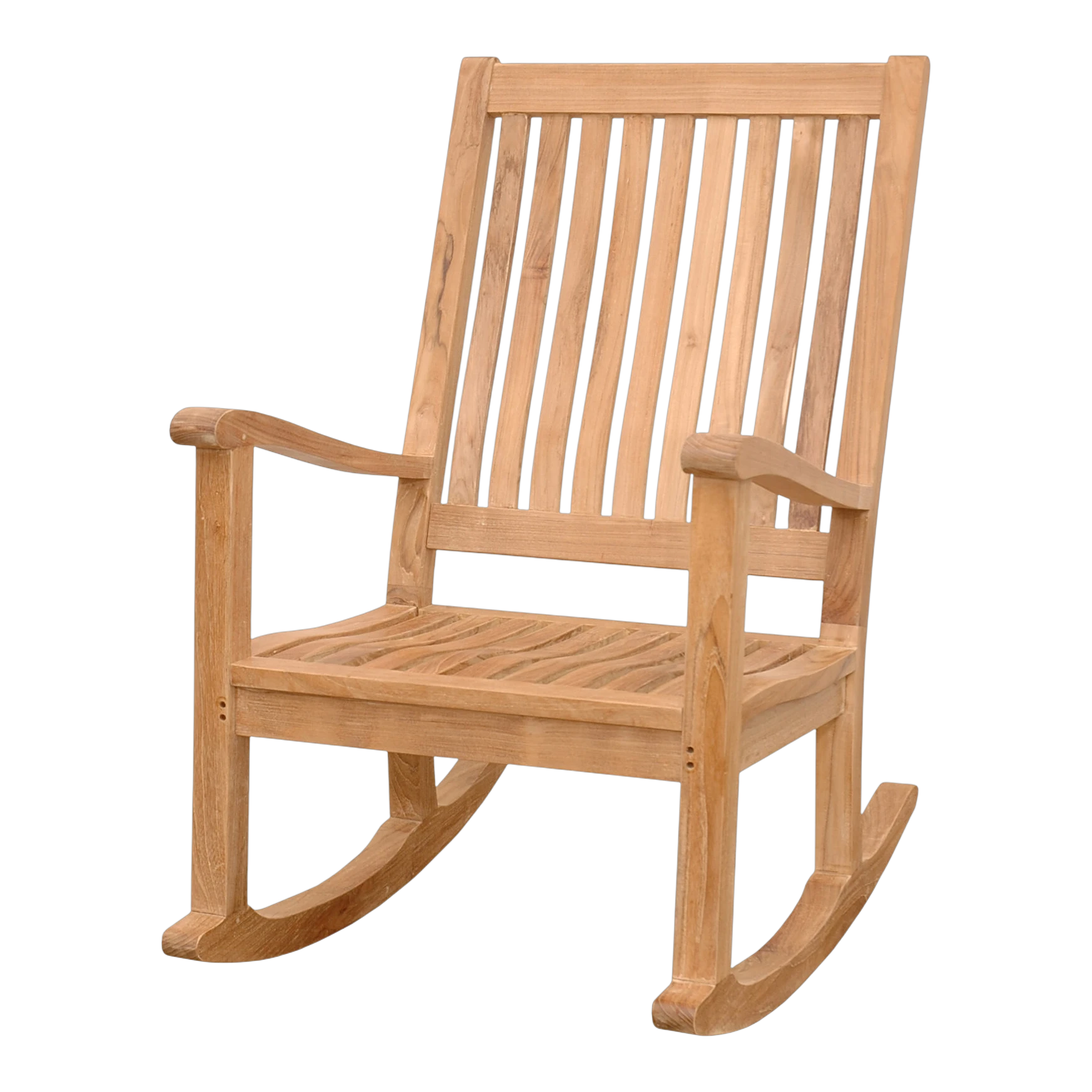 Rocking ChairTeak WoodEstimate weight capacity: 250 lbsCushion is not includedAnderson Teakdeep seat and raked back rest at an angle ideal for relaxing.Cushions (optional) are made of Sunbrella fabric, a water repellent material, preventing mildew and fadingQuickShip Cushions available in Natural, Cast Slate, Linen Antique Beige, and Cast CharcoalTeak outdoor furniture with premium quality products.