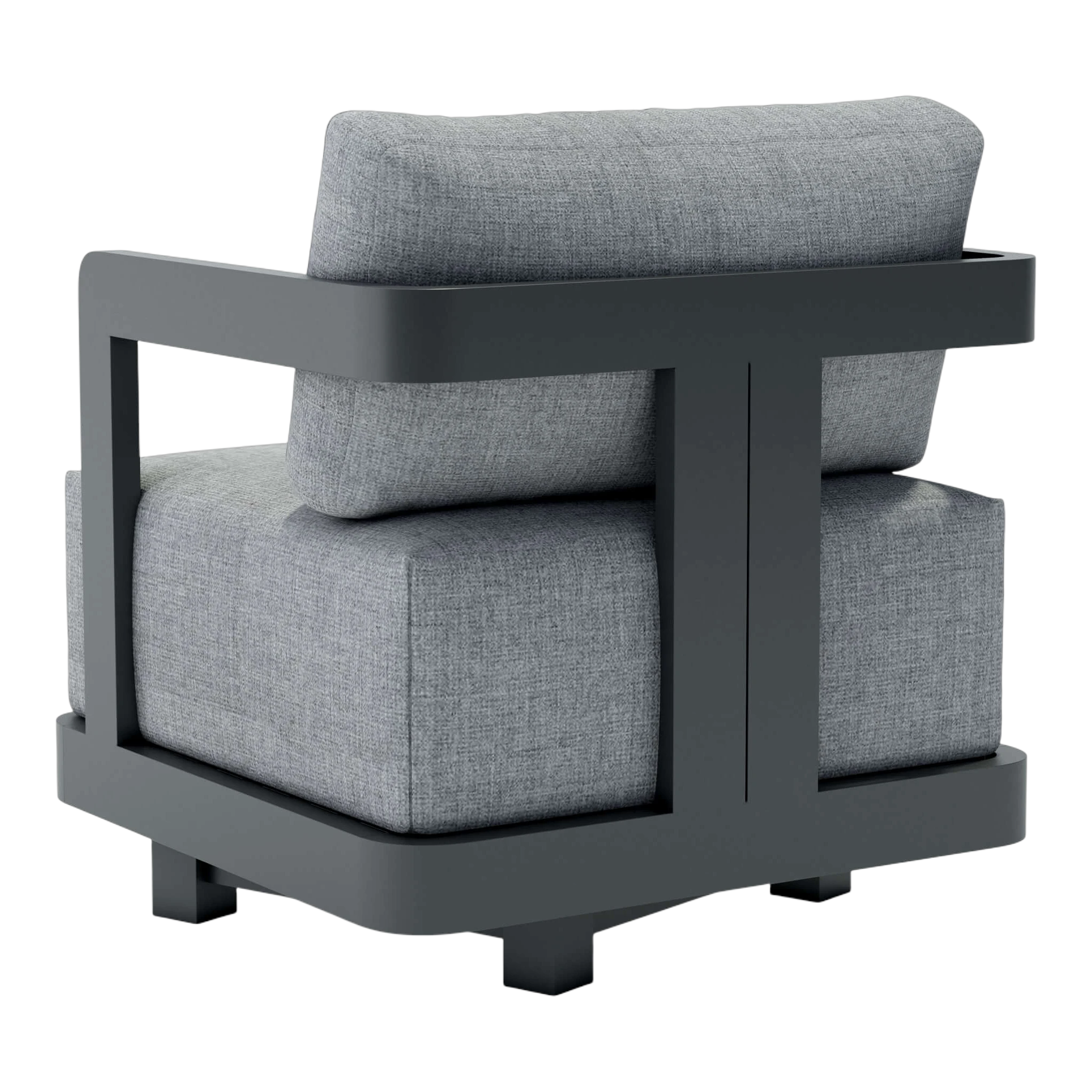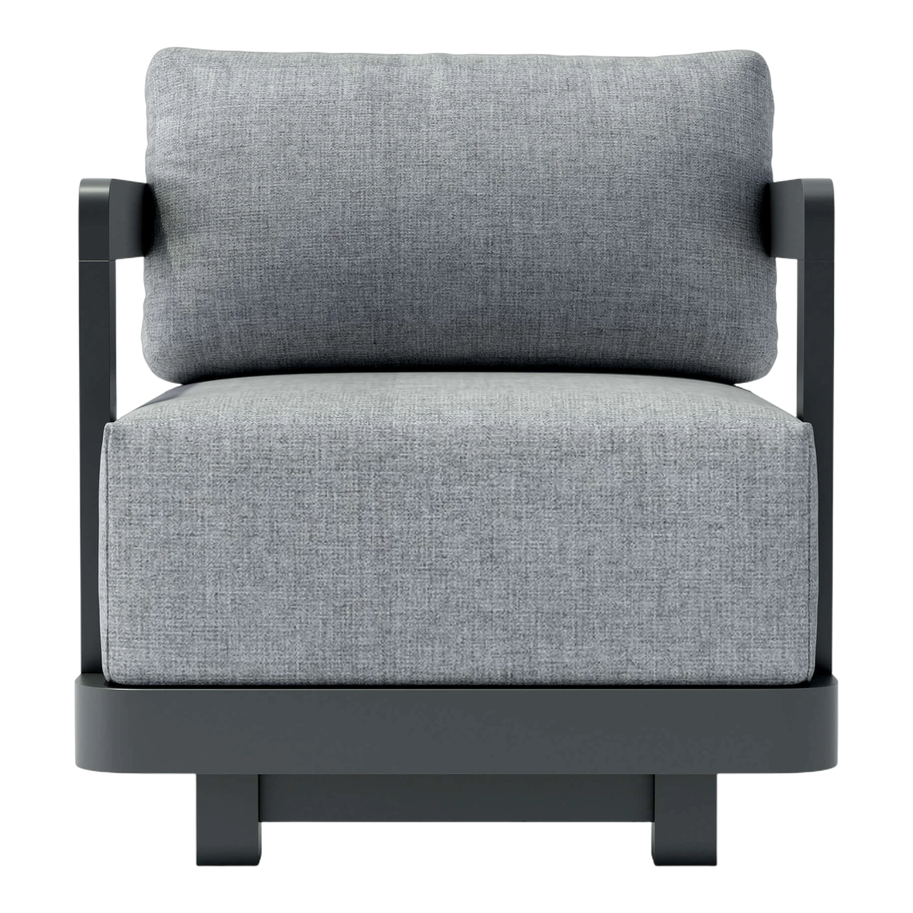 Modern, sleek and a comfort to sit on, the Granada Aluminum Swivel Armchair features a spacious seating room with a sleek curve design. Large seating cushions measuring 10.5” in thickness and 26” wide by 26 ½” in length, its soft but firm feel will sink you in for a comfortable and enjoyable deep seating experience. Enjoy 360 degrees of unhindered swivel movement Add matching pieces from the Granada Deep Seating Aluminum Collection as the ottoman, a sofa, the loveseat, side and coffee table, or the armchair. Made of machine crafted aluminum frames powder coated in a dark grey finish, this chair comes with cushions from All-Weather Sunbrella Fabrics. The perfect furniture set for the outdoors as well as for indoor use.