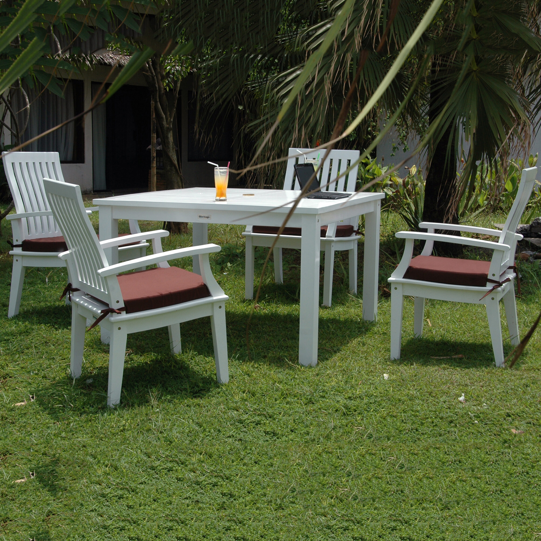 Mahogany white paint1 TB-P047SQ Magnolia Square Dining Table4 CHD-P799 Magnolia Dining ArmchairCushion is not includedHeritage Collection a smooth, white, durable indoor outdoor furniture. Can be use for indoor as well as outdoor furniture. Design using mahogany solid hardwood painted with multiple coats oven process to ensures that Heritage Collection will stand out from the elements for decades   Â