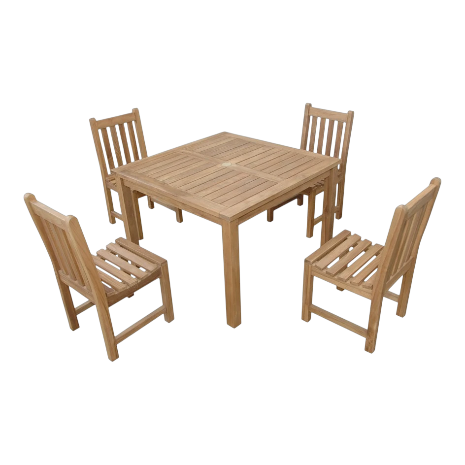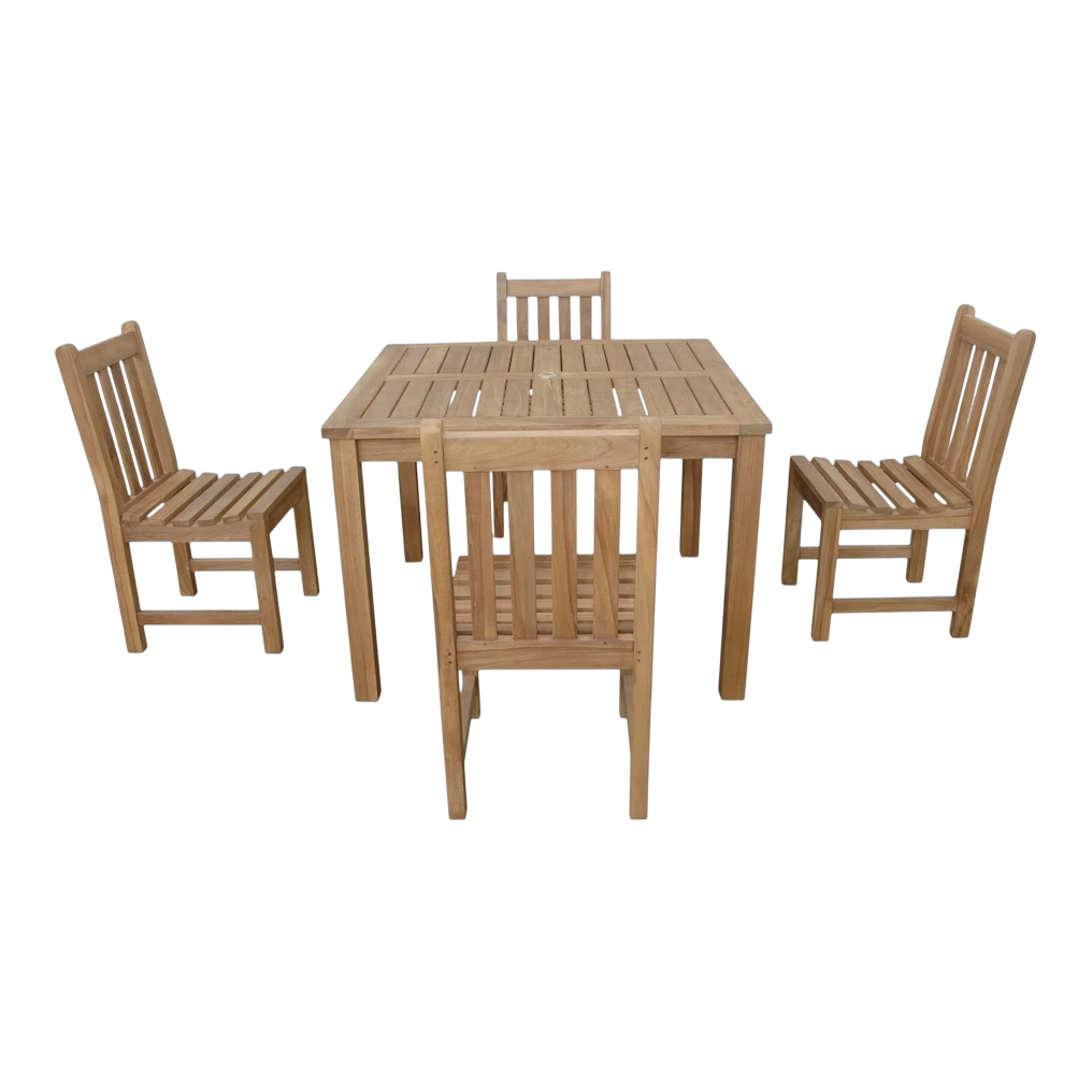 1 TB-4242SQ Montage 42″ Square Table4 CHD-2040 Braxton Dining ChairCushion is not includedLeft over premium teak wood treated with water-base sealerTeak WoodKiln-dry processCushions (optional) are made of Sunbrella fabric, a water repellent material, preventing mildew and fadingInner cushion is made of foam with a Dacron wrap. Total thickness is 2″Chapman Collection