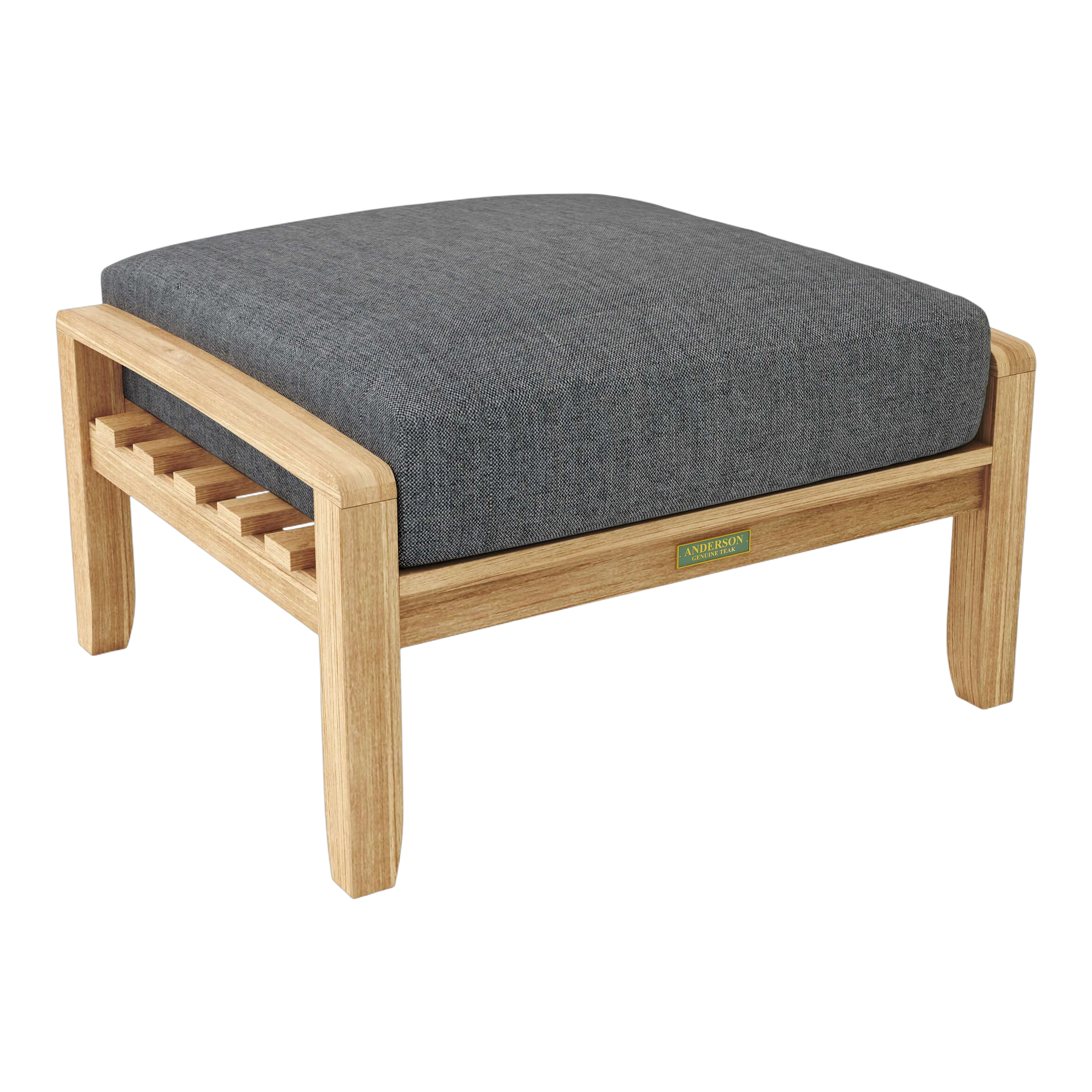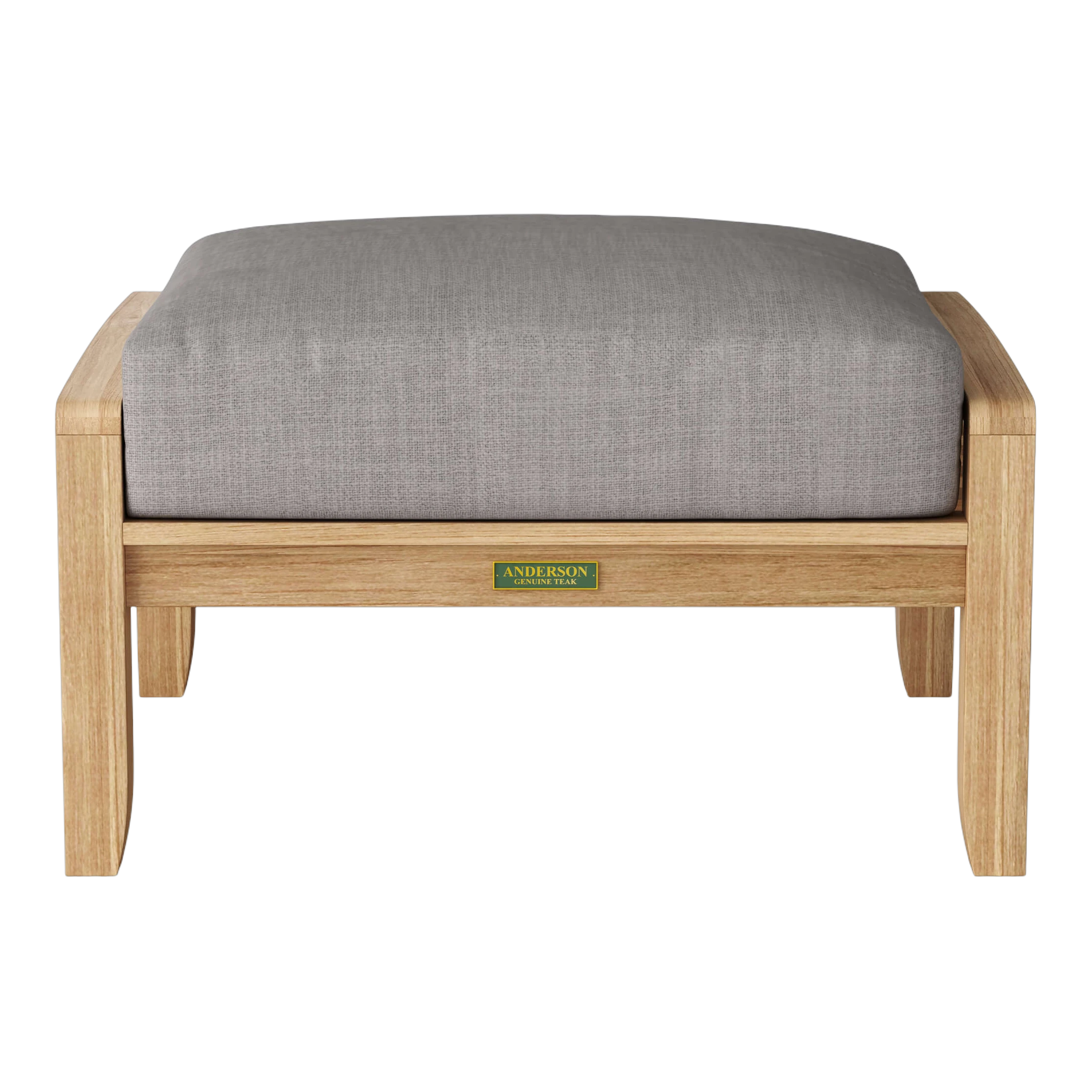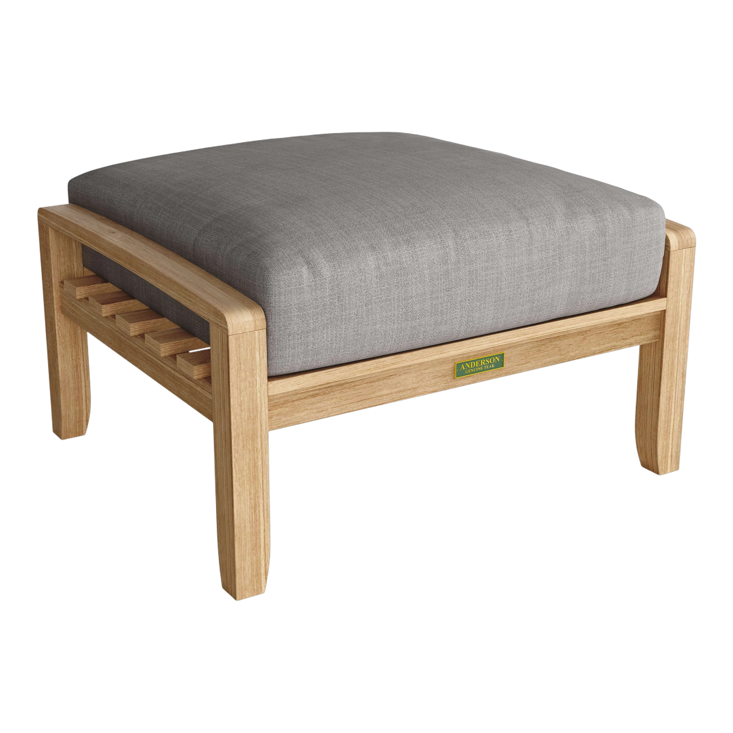 Natesepa OttomanTeak WoodEstimate weight capacity: 300 lbsAnderson Teakcomfortable cushions that will last outdoors without mildew, and minimal discoloration.QuickShip Cushions available in Natural, Burgandy, JockeyRed, Teak, Navy, Linnen Antique Beige, Linen Champagne, & Forest Green (1 week faster)Custom Order Cushions available in 36 colors from SunbrellaTeak outdoor furniture with premium quality products.