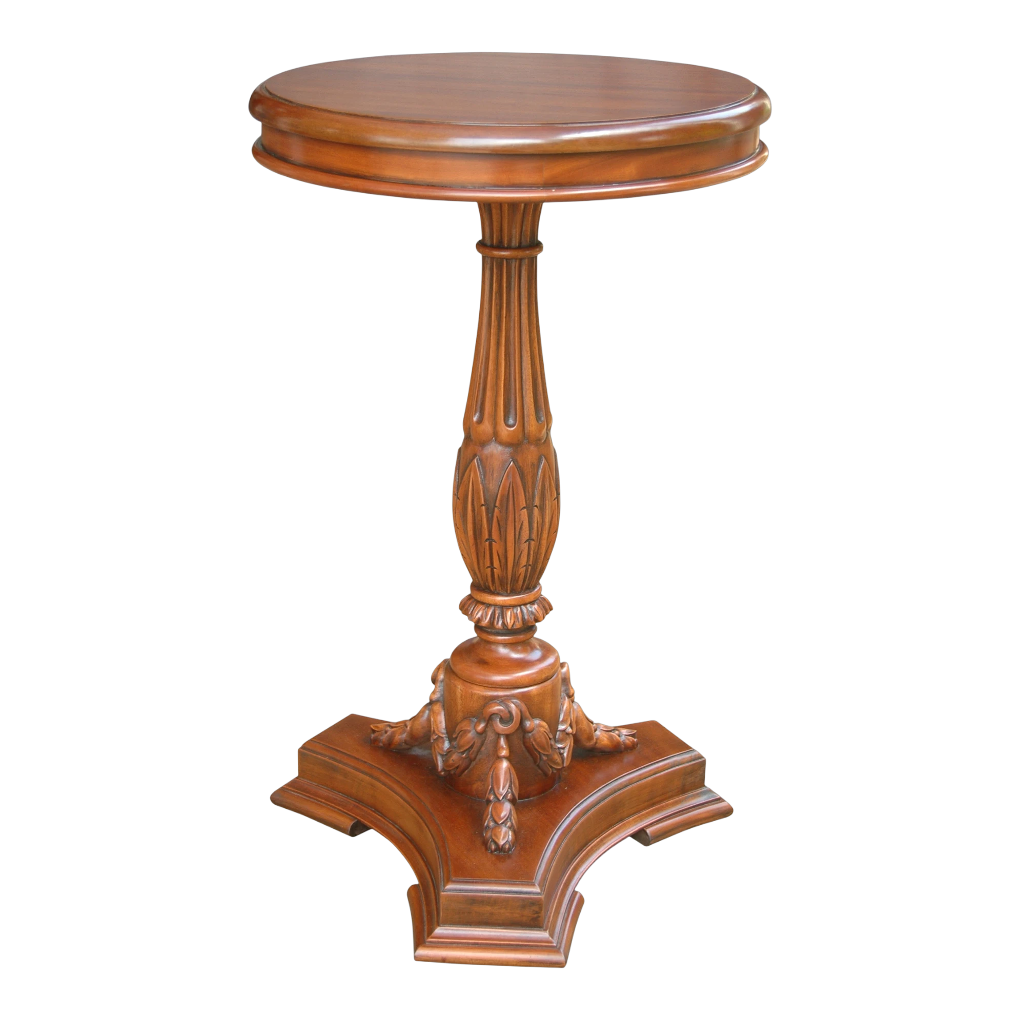 The Occasional Flower Side table is the perfect antique reproduction mahogany pedestal to showcase your flowers or other collectibles. Features floral themed designs elegantly carved around the table.