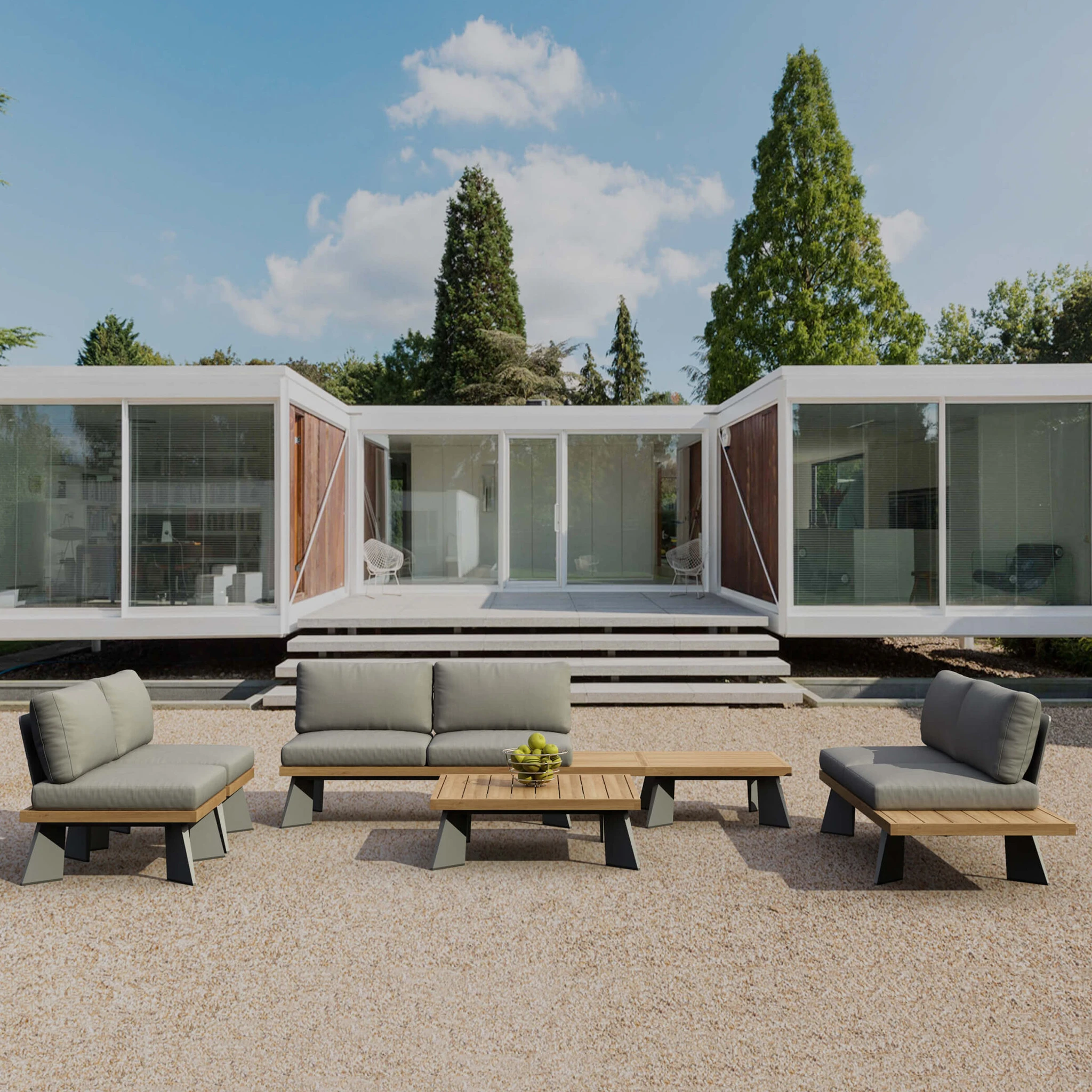 2 DS-821 Oxford Platform 1-Seater2 DS-822 Oxford Platform 2-Seater1 DS-823 Oxford Square Table1 DS-824 Oxford Corner Table2 mm thick Aluminum Frame with High Quality Powder CoatingCushion is includedComes in flat carton box for efficient shipping and light/easy assembly requiredSolid teak wood for the seats and tables
