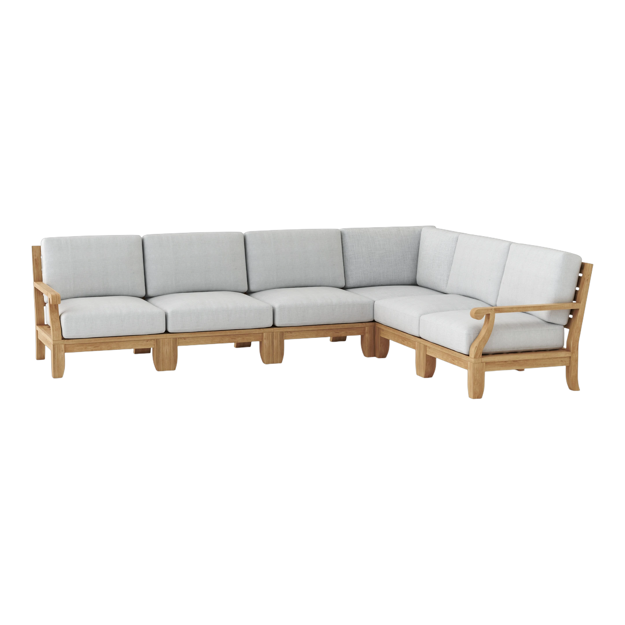 Indulging whoever sits in its presence, the Riviera Modular Deep Seating is a standout piece of furniture for the home or yard. At first glance, its considerable size and quality built frame becomes apparently noticeable complementing its stylish curved design and armchair whorl. With seating up to five, entertain guests in the comfort of your home or yard with this sectional Riviera Modular Set; made of premium grade unfinished teak sanded smooth in its natural form and color. Includes 6” thick cushions from All-Weather Sunbrella fabrics with choice of pattern and color that truly makes this teak deep seating pop.