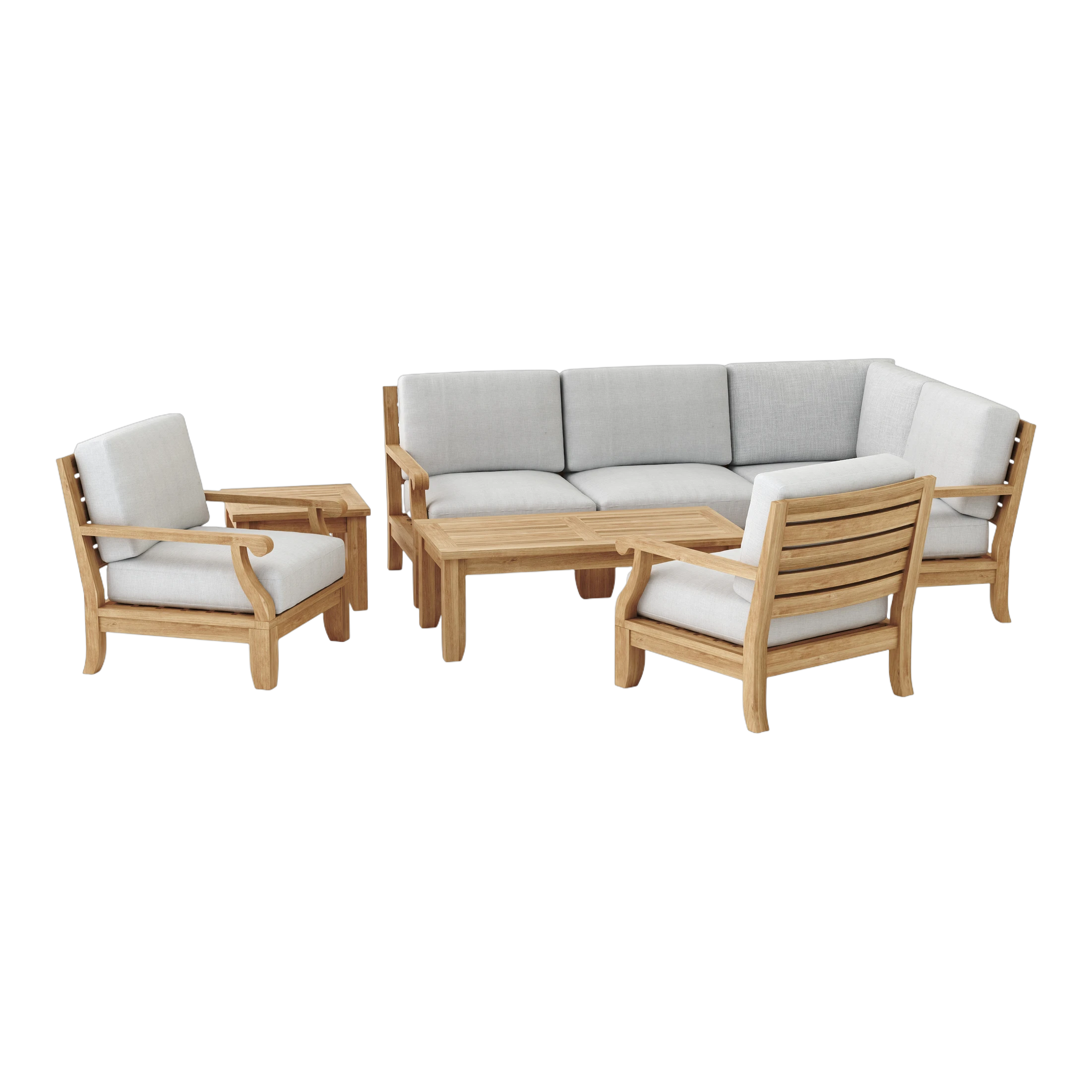 2 DS-601 Riviera Deep Seating Armchair1 DS-602 Riviera Right Modular1 DS-603 Riviera Left Modular1 DS-505 Luxe Center Modular1 DS-504 Luxe Corner Modular1 DS-506 Luxe Rectangular Coffee TableMade with kiln-dried, grade A teak wood.Comfortable Sunbrella cushions that will last outdoors without mildew, and minimal discoloration.QuickShip Cushions available in Natural, Burgandy, JockeyRed, Teak, Navy, Linnen Antique Beige, Linen Champagne, & Forest Green (1 week faster)Custom Order Cushions available in 36 colors from Sunbrella