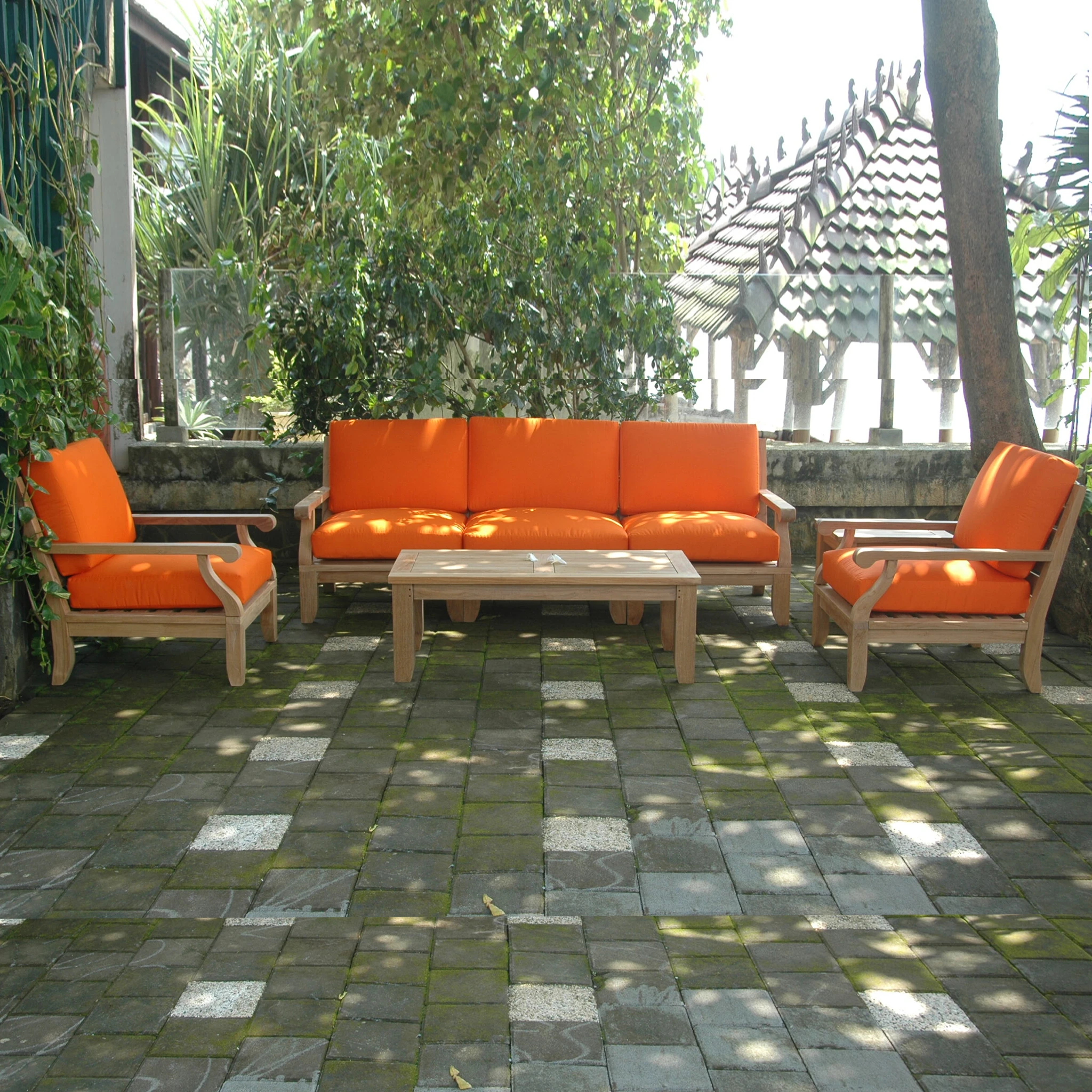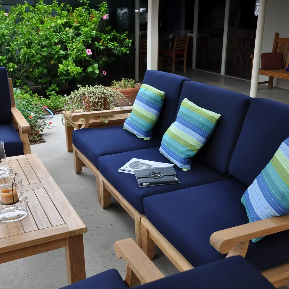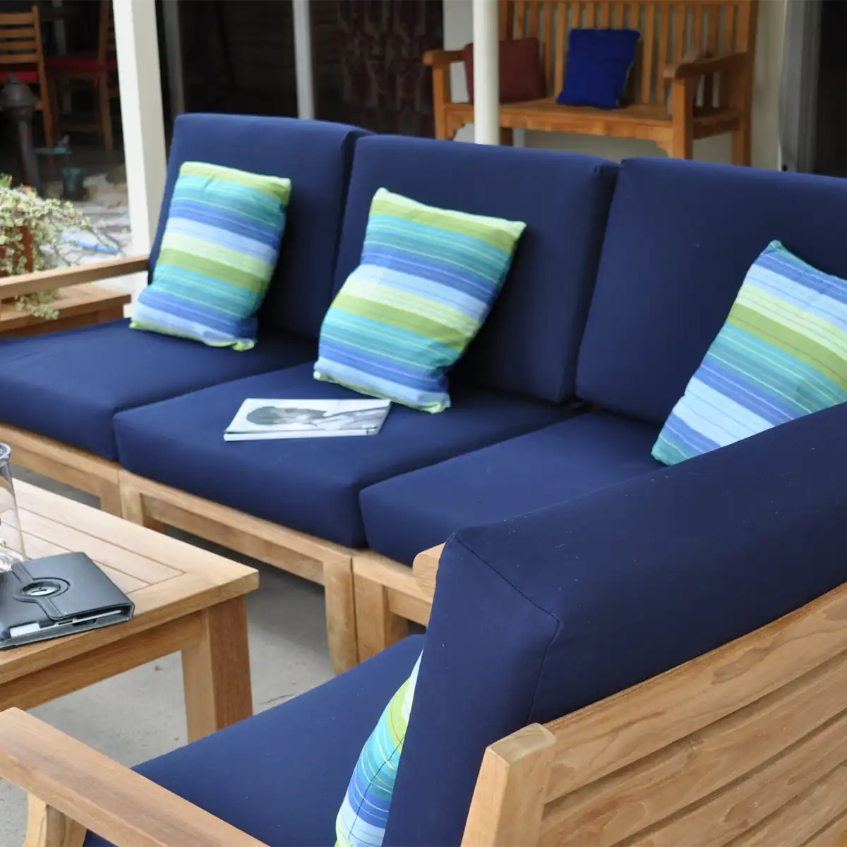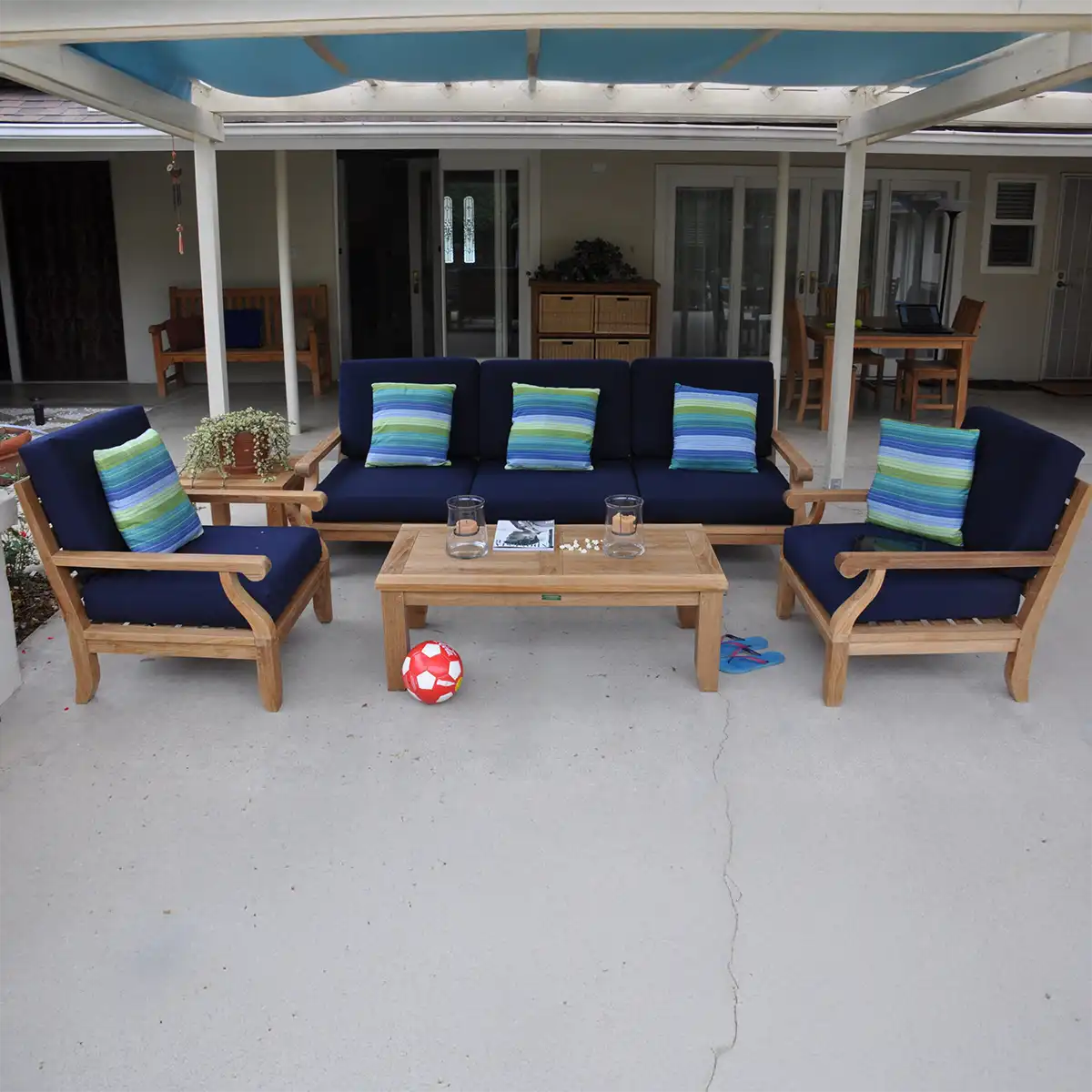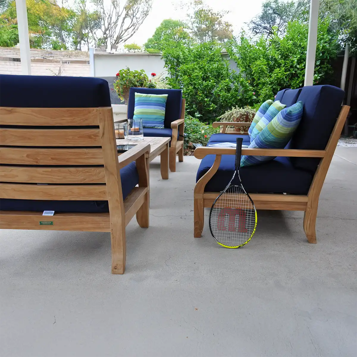 2 DS-601 Riviera Deep Seating Armchair1 DS-602 Riviera Right Modular1 DS-603 Riviera Left Modular1 DS-505 Luxe Center Modular1 DS-506 Luxe Rectangular Coffee Table1 DS-508 Luxe 20″ Square Side TableMade with kiln-dried, grade A teak wood.Comfortable Sunbrella cushions that will last outdoors without mildew, and minimal discoloration.QuickShip Cushions available in Natural, Burgandy, JockeyRed, Teak, Navy, Linnen Antique Beige, Linen Champagne, & Forest Green (1 week faster)Custom Order Cushions available in 36 colors from Sunbrella