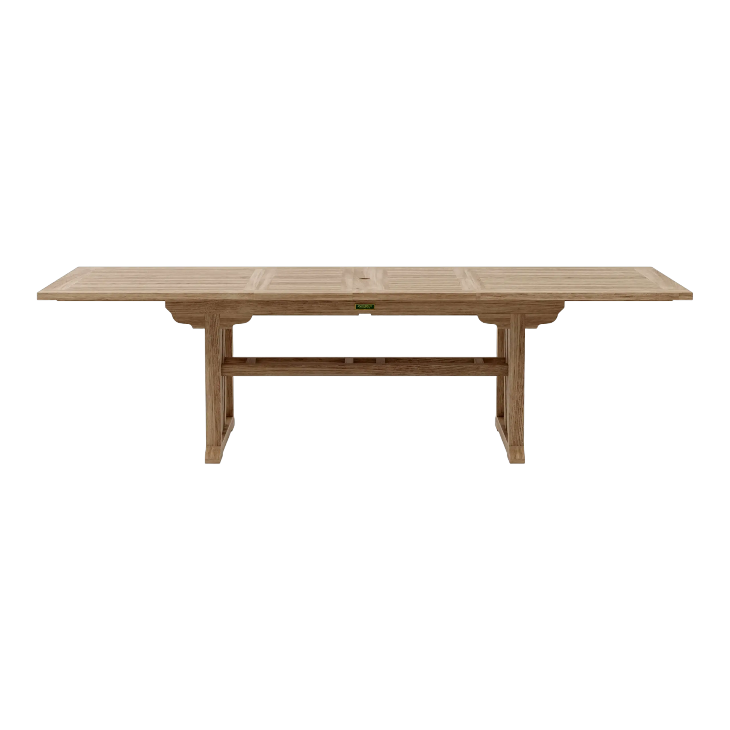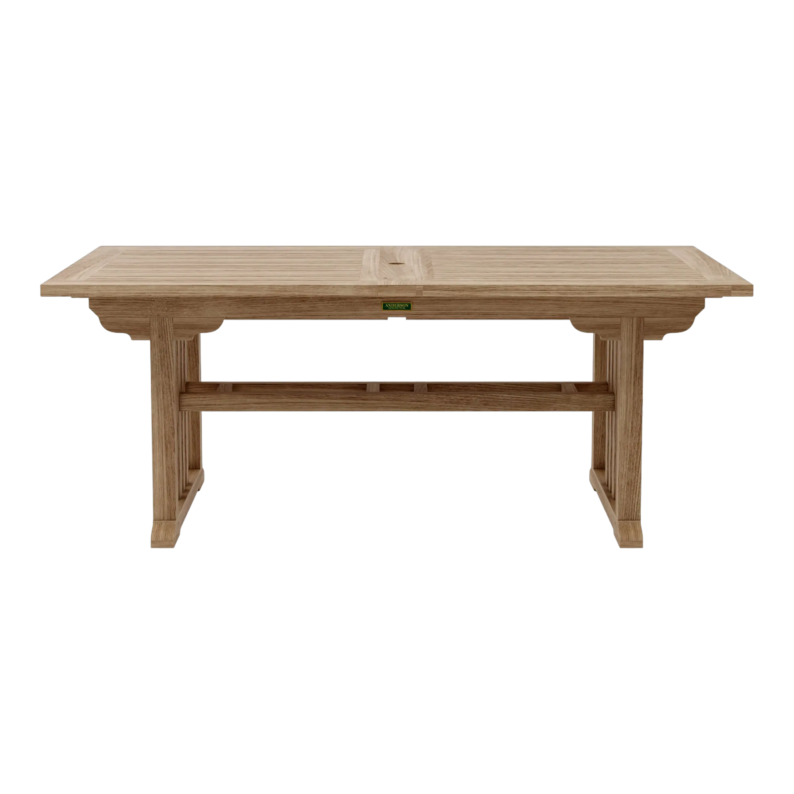 Solid Teak Rectangle Extension TableTeak WoodAnderson TeakSeats 8-10 peopleCome with umbrella hole and brass plug to cover itunique built-in butterfly pop-up leafThe leaf folds away for easy storageTeak outdoor furniture with premium quality products.