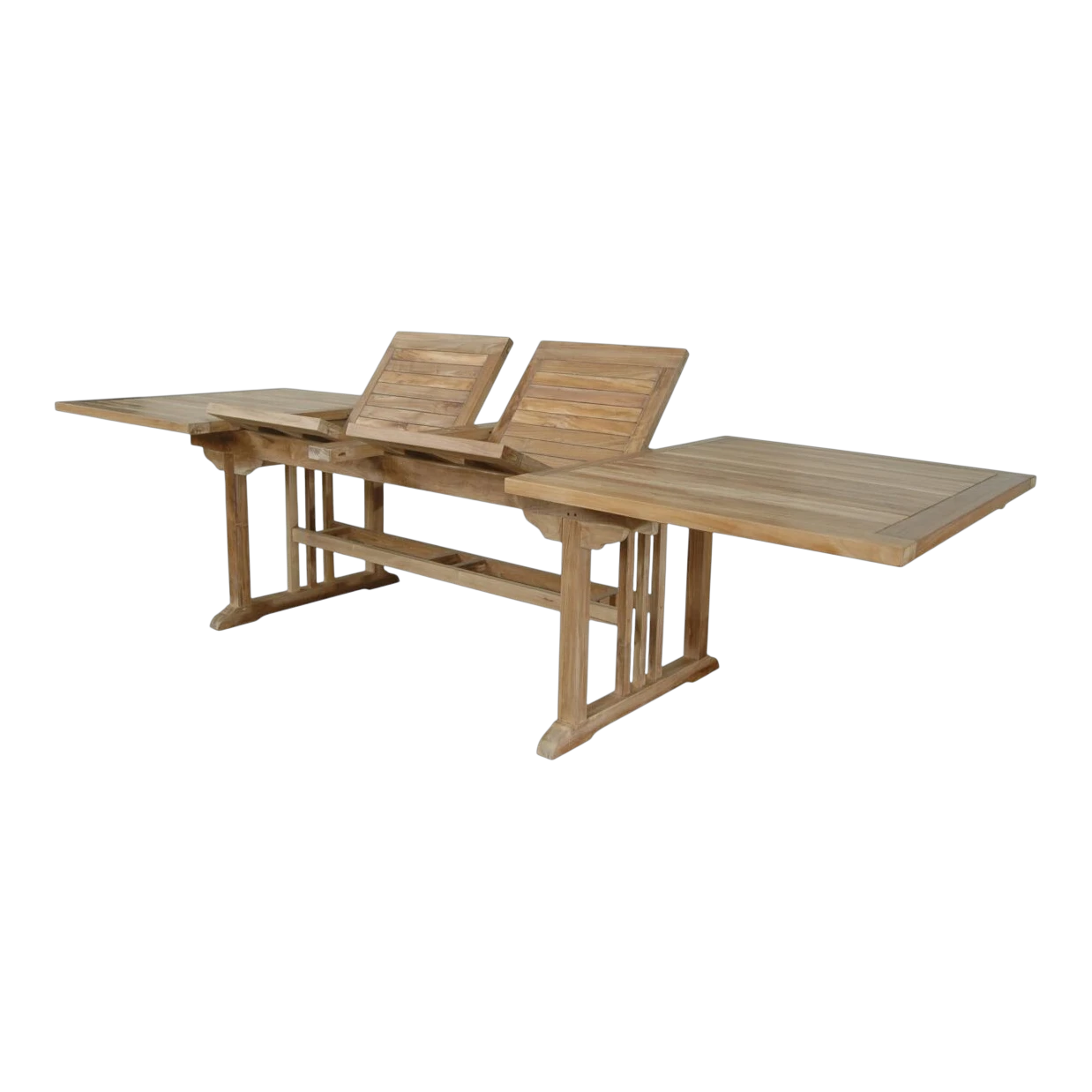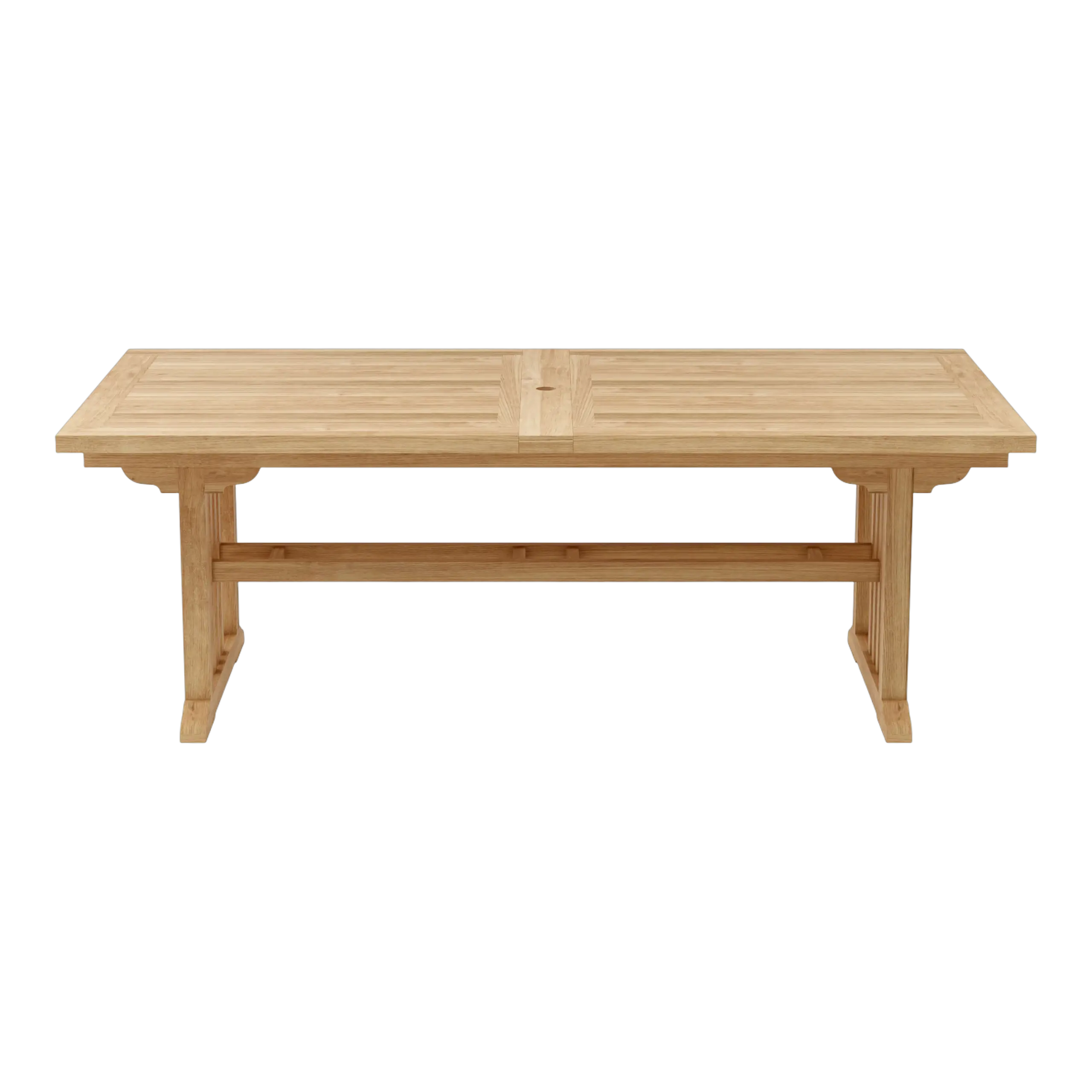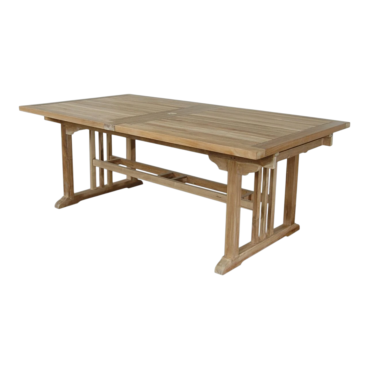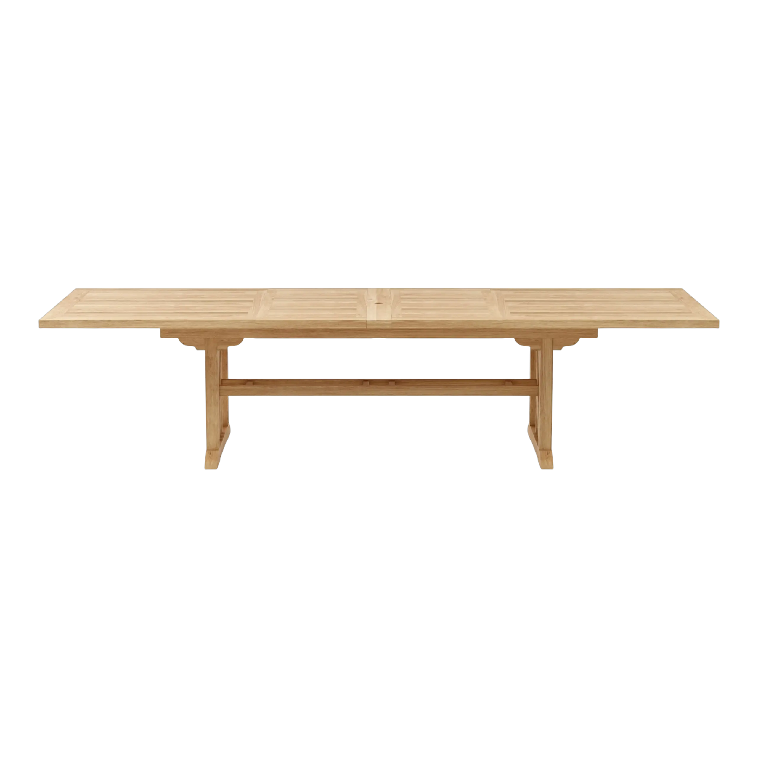 Solid Teak Rectangle Extension TableTeak WoodAnderson TeakSeats 12-14 peopleCome with umbrella hole and brass plug to cover itunique built-in butterfly pop-up leafThe leaf folds away for easy storageTeak outdoor furniture with premium quality products.