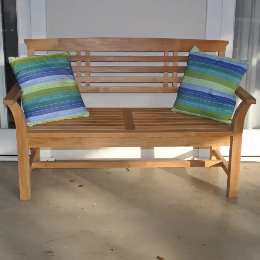The Sakura 2-Seater Bench designed with an orient style is a classic bench that will never go out of style but blends with any décor or setting. A very sturdy and quality built bench, it is also refined and elegant, sanded smooth to the touch for an authentic teak feel. Add Sunbrella All-Weather Cushions for added seating comfort, a water repellent material that prevents mildew, mold, and discoloration. Constructed from Premium Teak wood without finish in its natural form and color, it is the perfect material for weathering the outdoors through rain, hail, or shine.