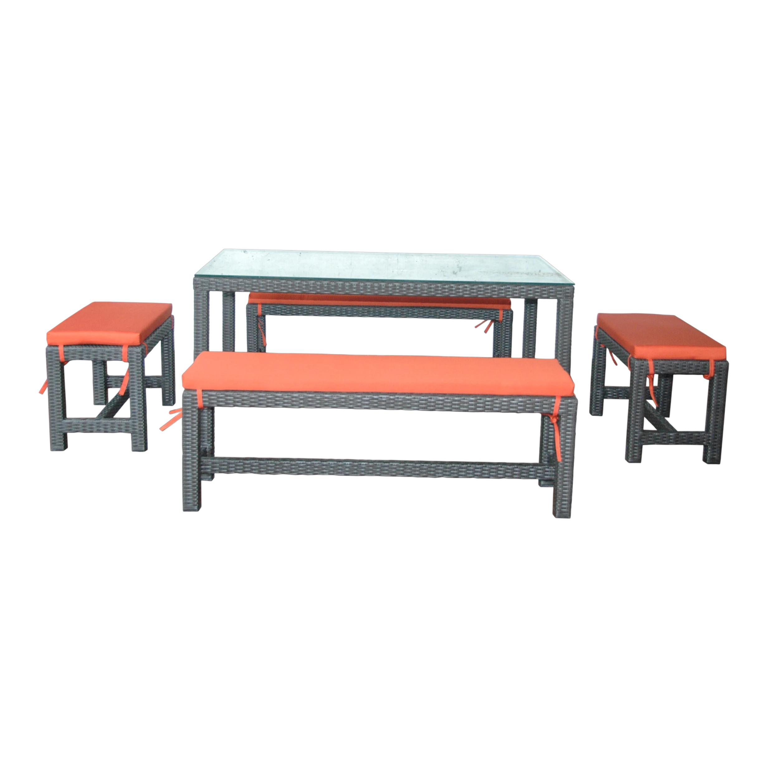 Rain, snow and extreme temperatures will not affect the beauty of this synthetic rattan durable furniture.  Sorrento collection by Anderson 5-piece dining set with rectangular table, 2 long & 2 short backless bench.  The collection features hand-selected, carefree and environmentally friendly materials that will last for years to come.