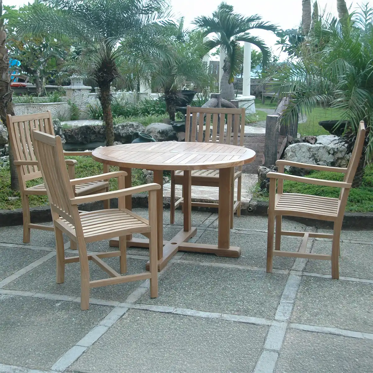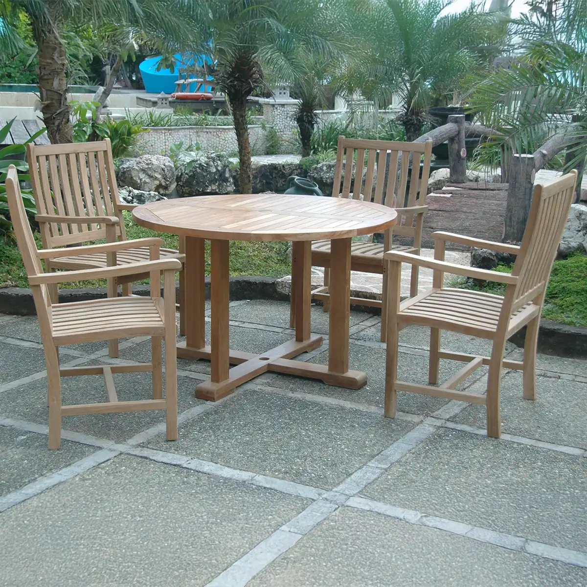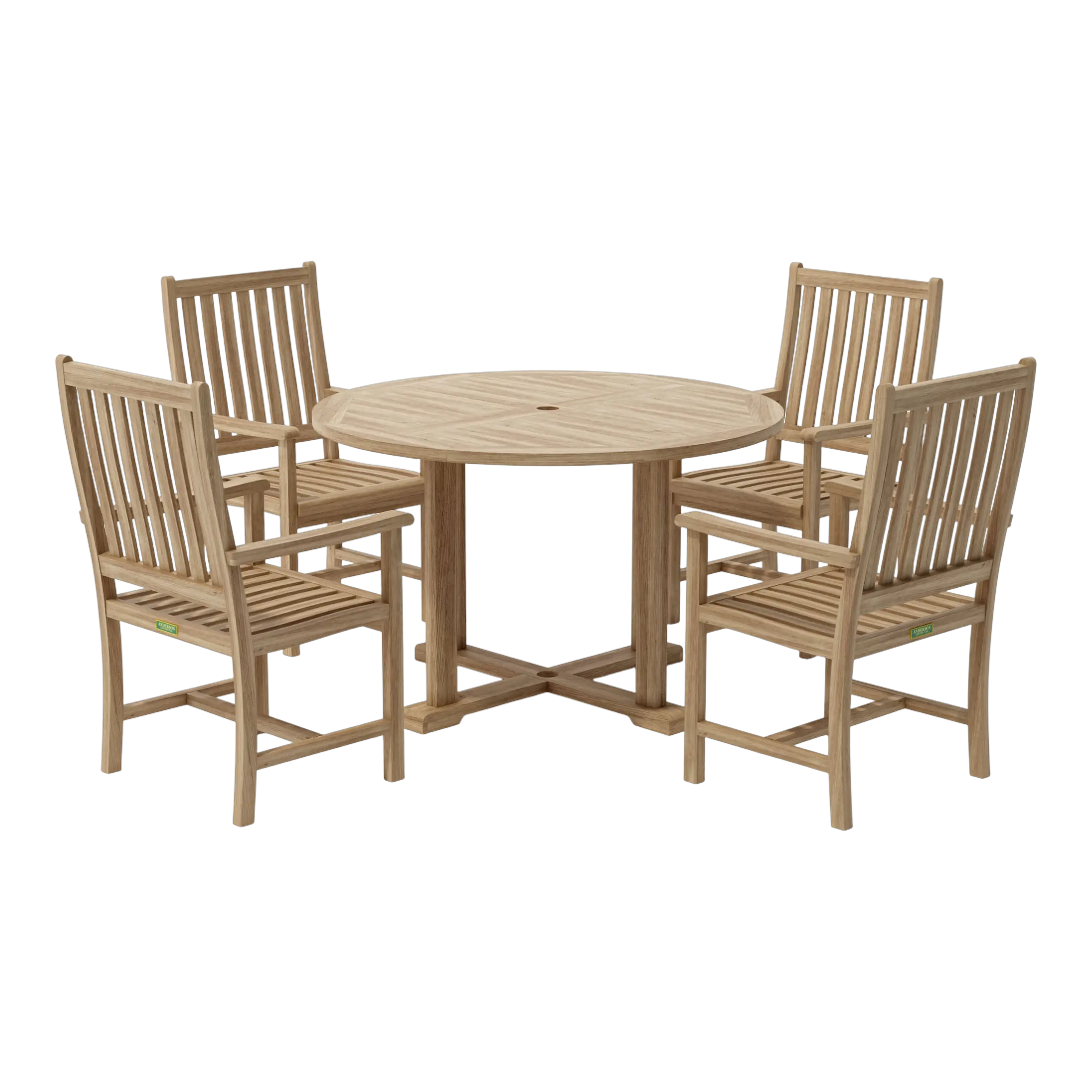 This traditional-style Tosca Dining Set has an ideal design for outdoor dining and relaxation for your garden, yard or home. Featuring the 47″ Tosca Round Table, it features an umbrella hole in the center included with a brass plug when not in use. Also includes four simple and classic Wilshire Dining Armchairs with contoured seats and angled back and armrest for added support and comfort. This solid construction with beautiful and traditional design will surely provide your family with many years of outdoor recreation. All pieces constructed from Grade-A Teak wood unfinished.