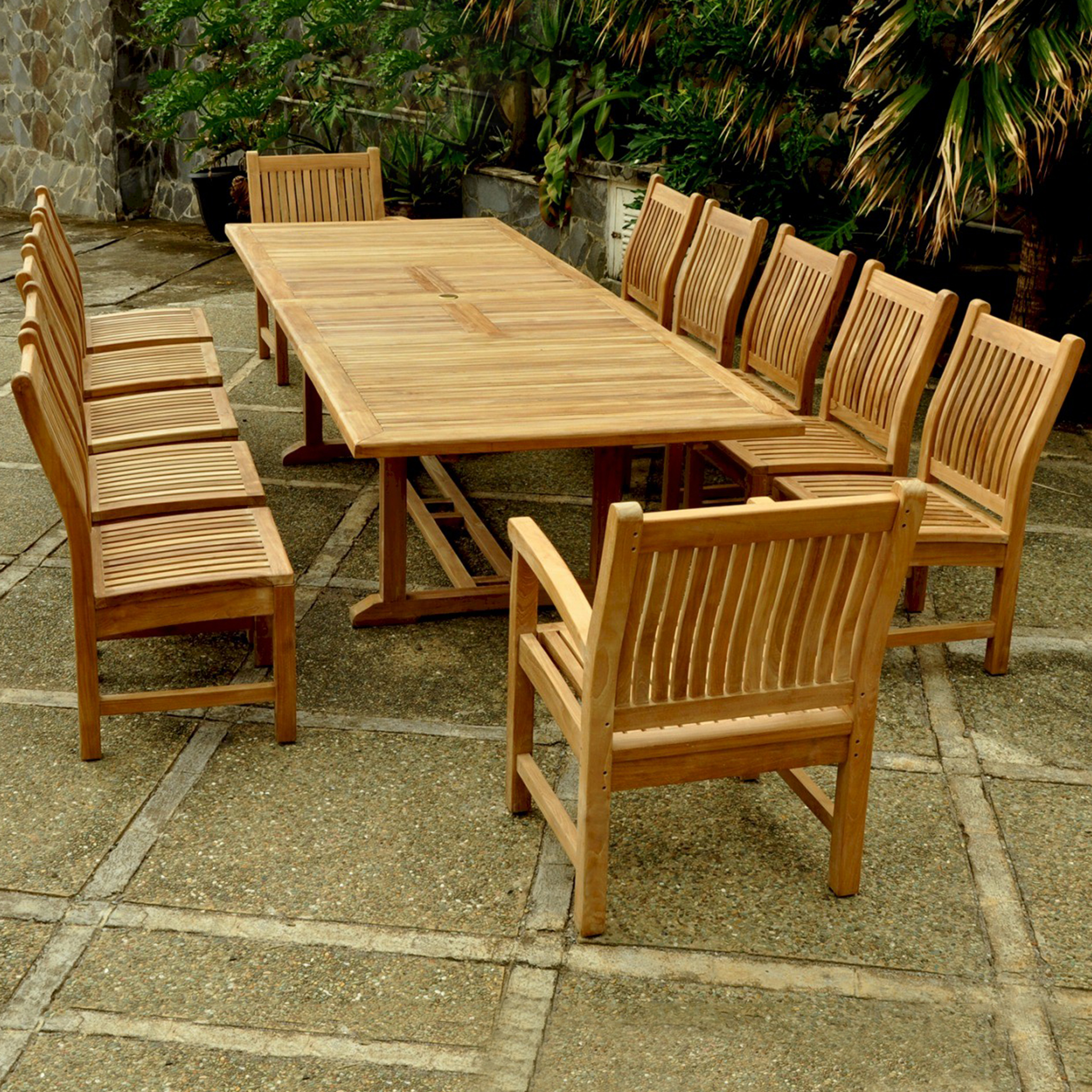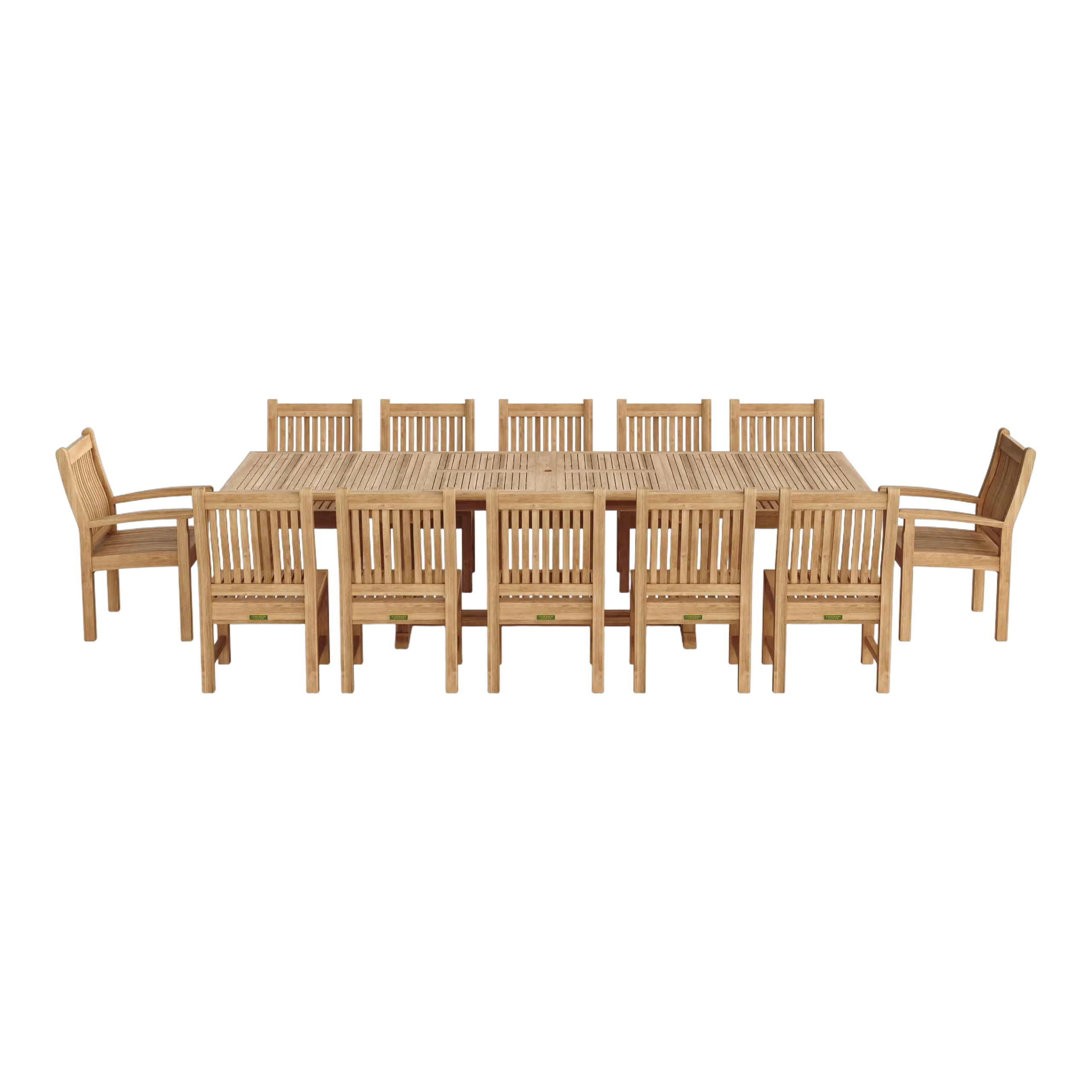 1 TBX-117RD Valencia 117″ Rectangular Double Extension Table10 CHD-111 Sahara Dining Chair2 CHD-112 Sahara Dining ArmchairCushion is not includedBuilt with extra thick Grade A quality teak to last for generations. It comes in knocked down, with easy assembly.  After all, it is perfect for your party family and friends gathering.Made with kiln-dried, grade A teak wood.Cushions (optional) are made of Sunbrella fabric, a water repellent material, preventing mildew and fadingInner cushion is made of foam with a Dacron wrap. Total thickness is 2″QuickShip Cushions available in Natural, Burgandy, JockeyRed, Teak, Navy, Linnen Antique Beige, Linen Champagne, & Forest Green