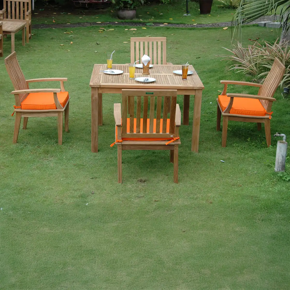1 TB-047SS 47″ Square Table w/ Small Slats4 CHD-709 Brianna Dining ArmchairTeak WoodCushion is not includedMade with kiln-dried, grade A teak wood.Cushions (optional) are made of Sunbrella fabric, a water repellent material, preventing mildew and fadingInner cushion is made of foam with a Dacron wrap. Total thickness is 2″QuickShip Cushions available in Natural, Burgandy, JockeyRed, Teak, Navy, Linnen Antique Beige, Linen Champagne, & Forest GreenCustom Order Cushions available in 36 colors from Sunbrella