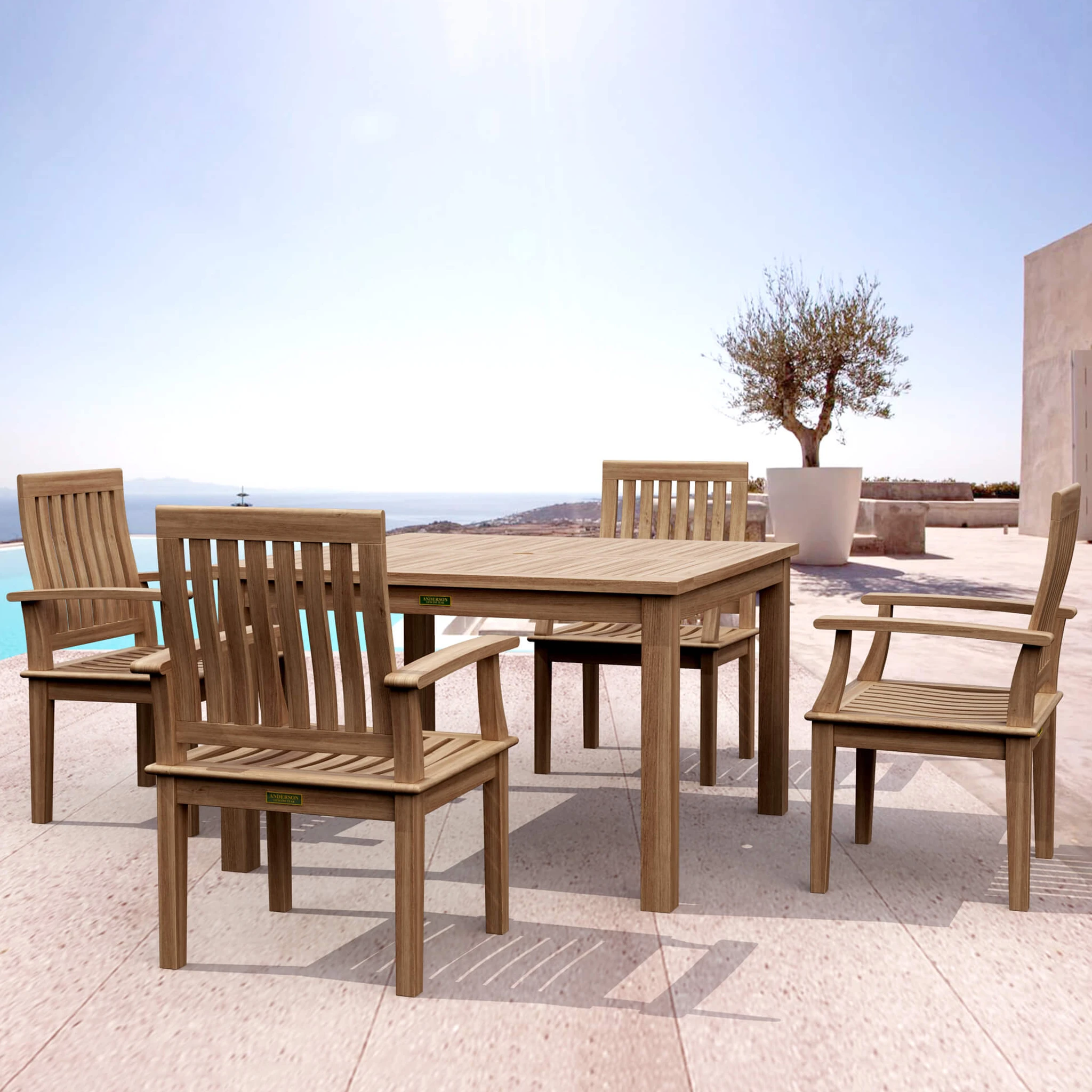 The Windsor teak wood table is a square dining table that is perfect for both indoors and out. Perfect for outdoor dining for four with family and friends, this table arrives with four Brianna Dining Armchairs featuring a unique taper and curve chair design. The table and chairs are all constructed using mortise and tenon construction ensuring strength and durability. Made of premium quality plantation grown teak, it is unfinished and sanded smooth for a natural feel perfect for the outdoors. Add All-Weather Sunbrella Fabrics and cushions for extra comfort.